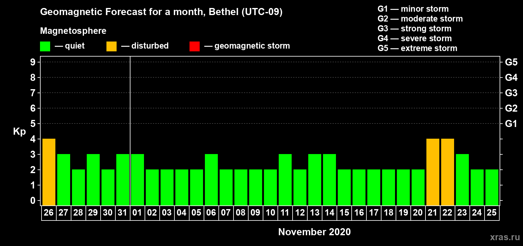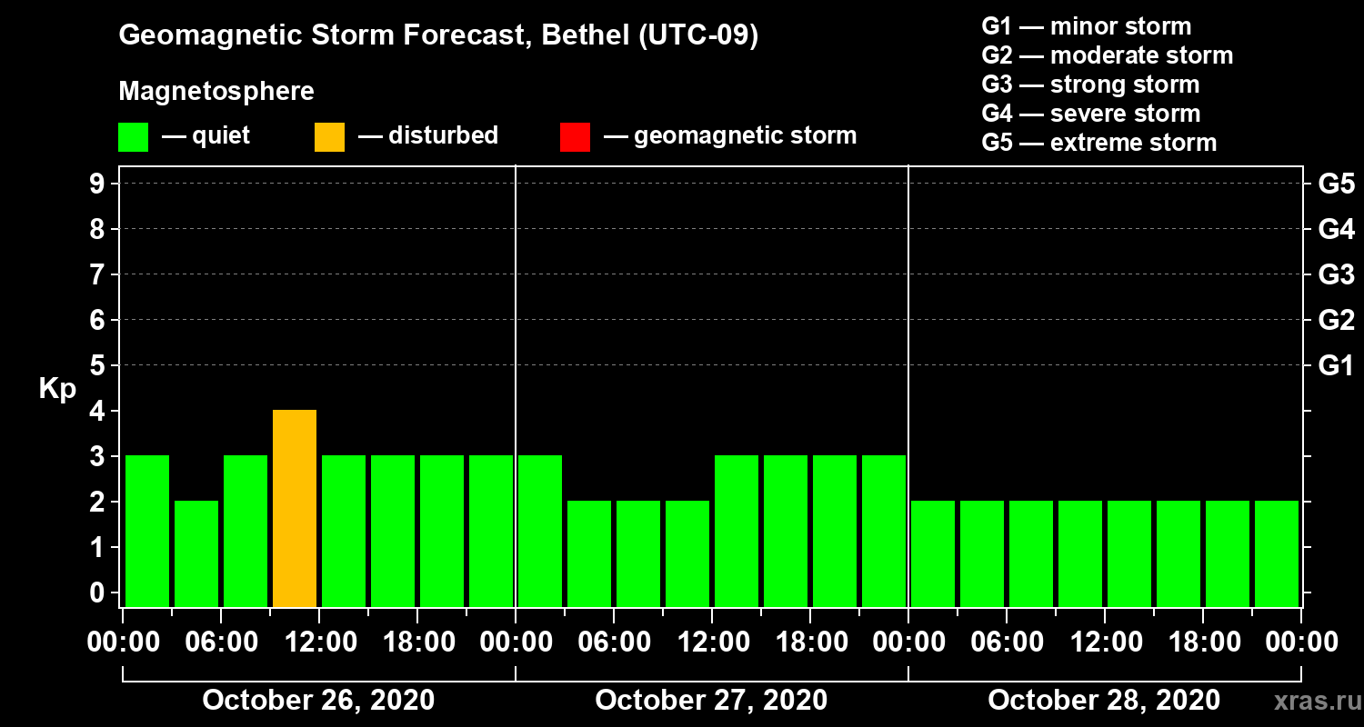Geomagnetic storm forecast in Bethel for Oct 26, 2020