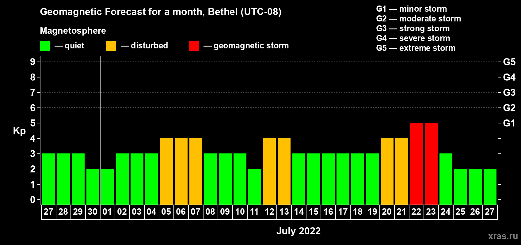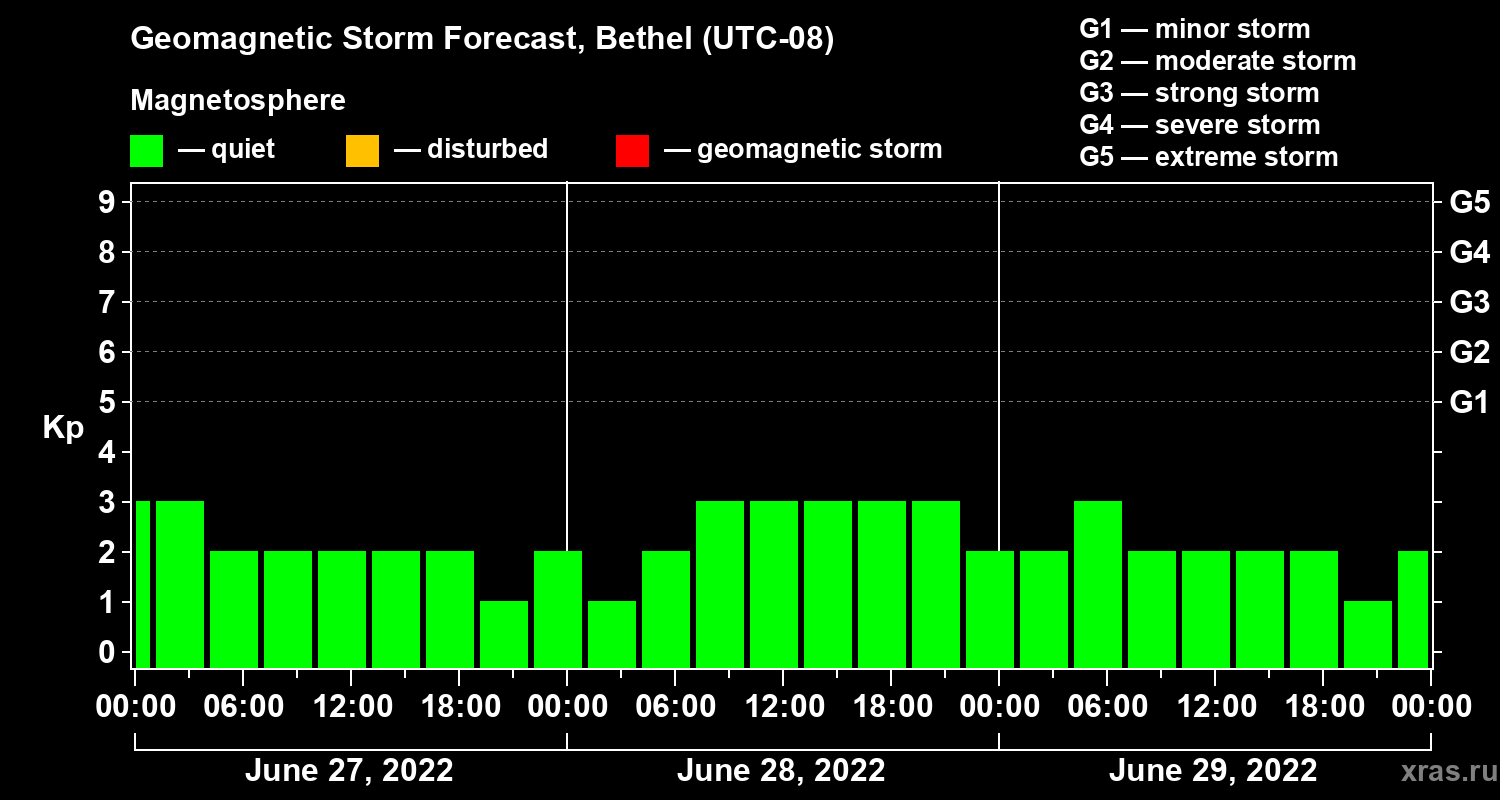 Geomagnetic storm forecast in Bethel for Jun 27, 2022