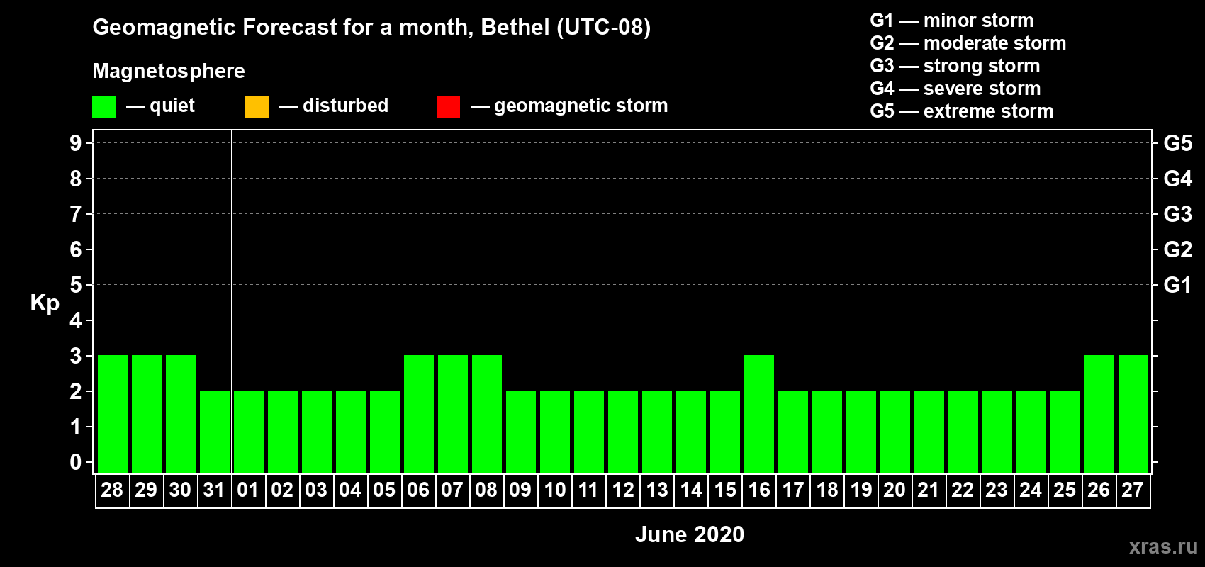Geomagnetic storm forecast in Bethel for May 28, 2020