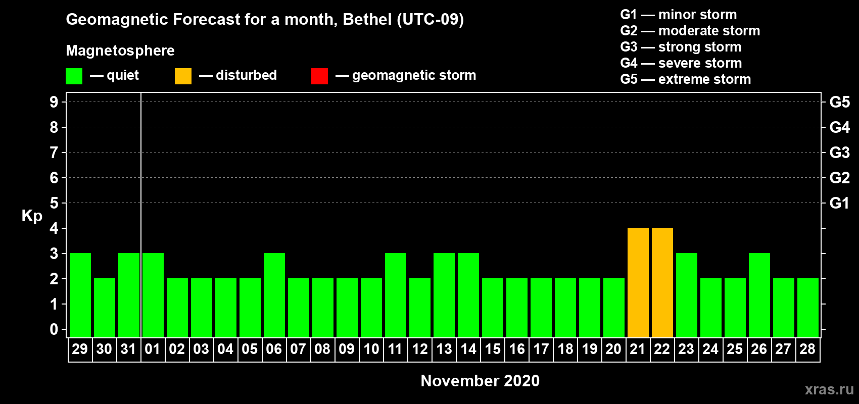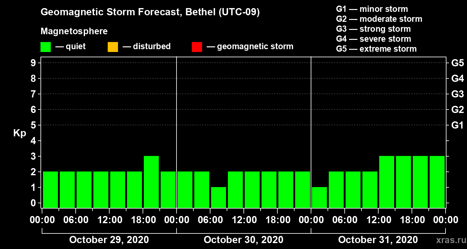 Geomagnetic storm forecast in Bethel for Oct 29, 2020