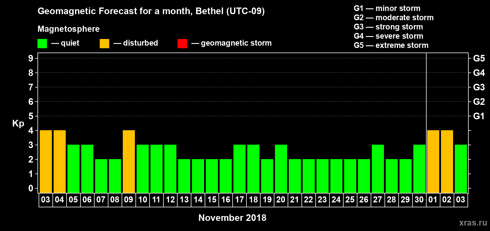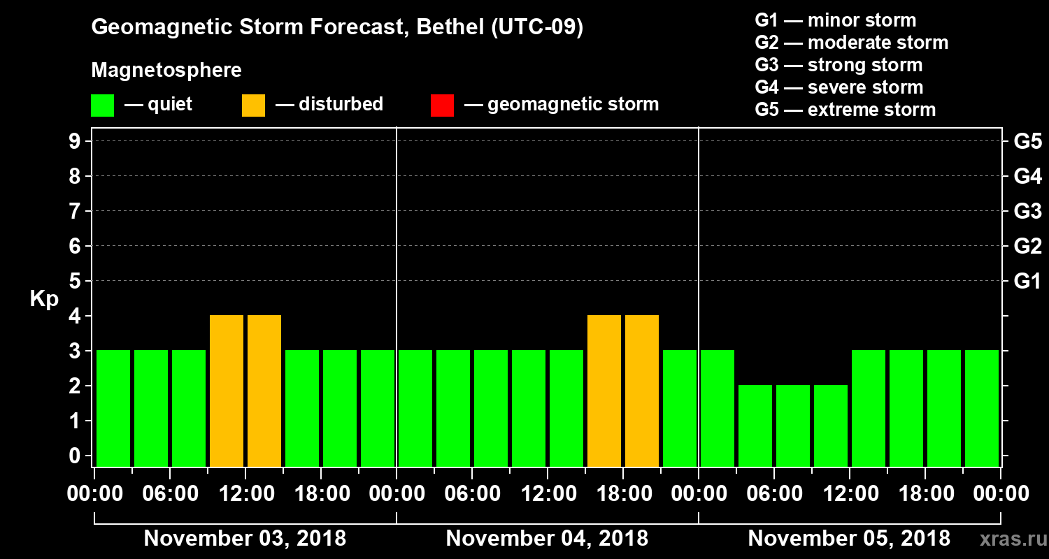 Geomagnetic storm forecast in Bethel for Nov 03, 2018