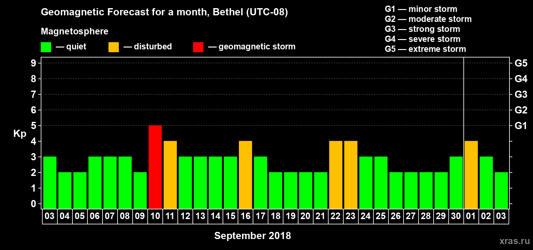 Geomagnetic storm forecast in Bethel for Sep 03, 2018