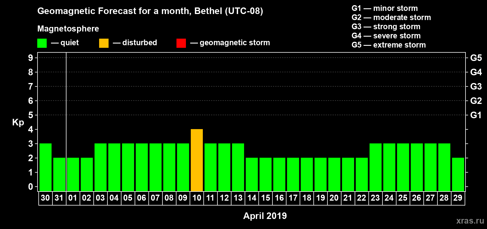 Geomagnetic storm forecast in Bethel for Mar 30, 2019