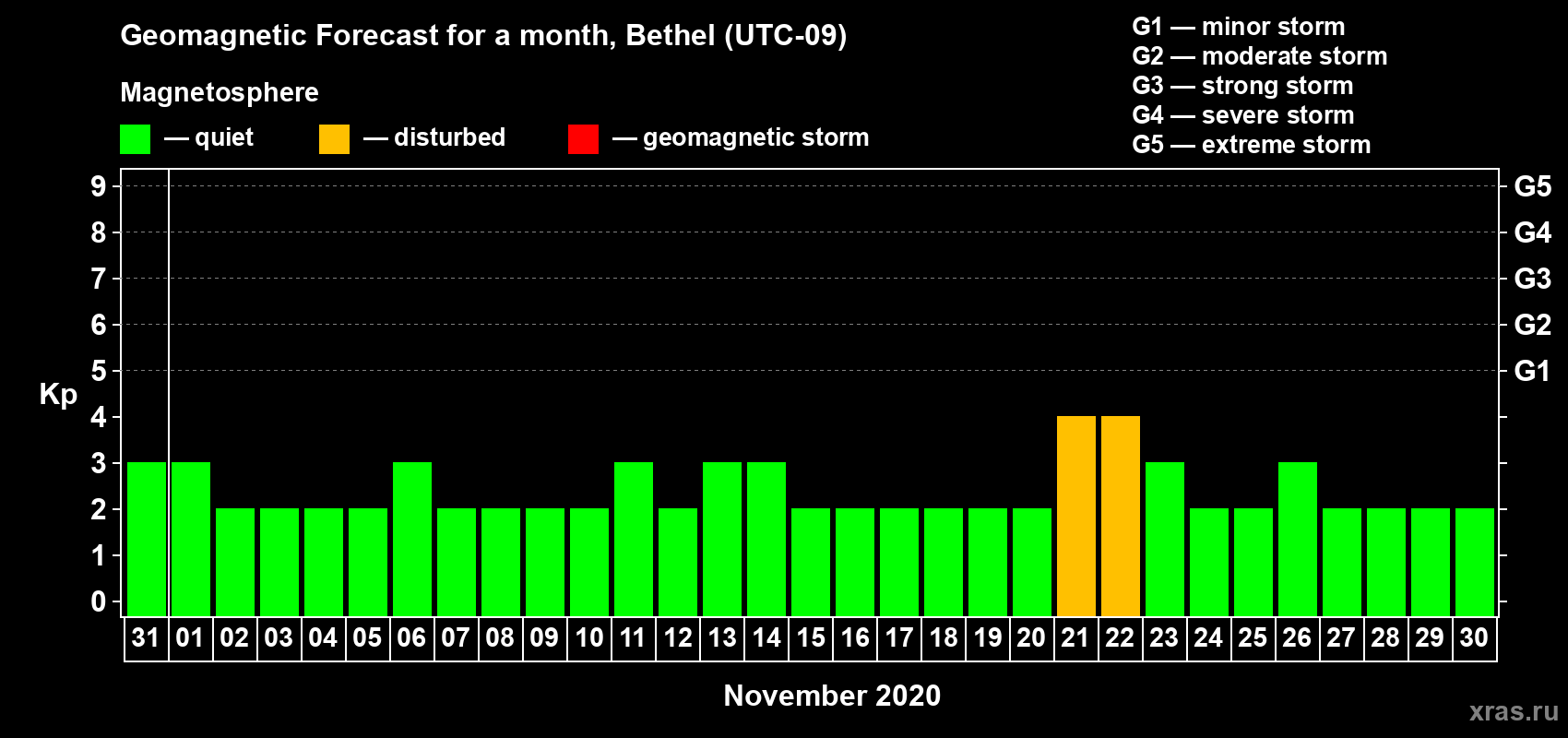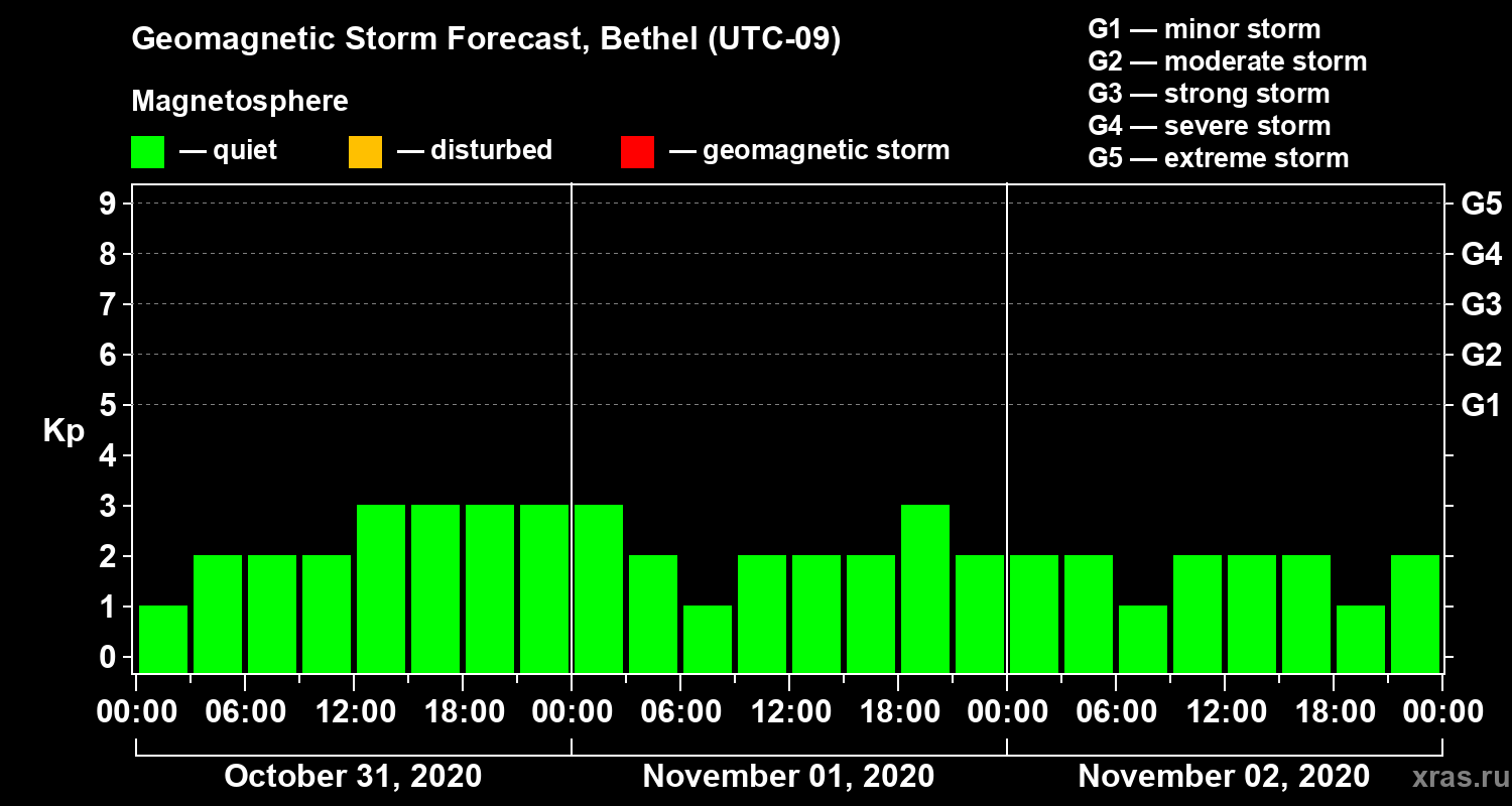 Geomagnetic storm forecast in Bethel for Oct 31, 2020