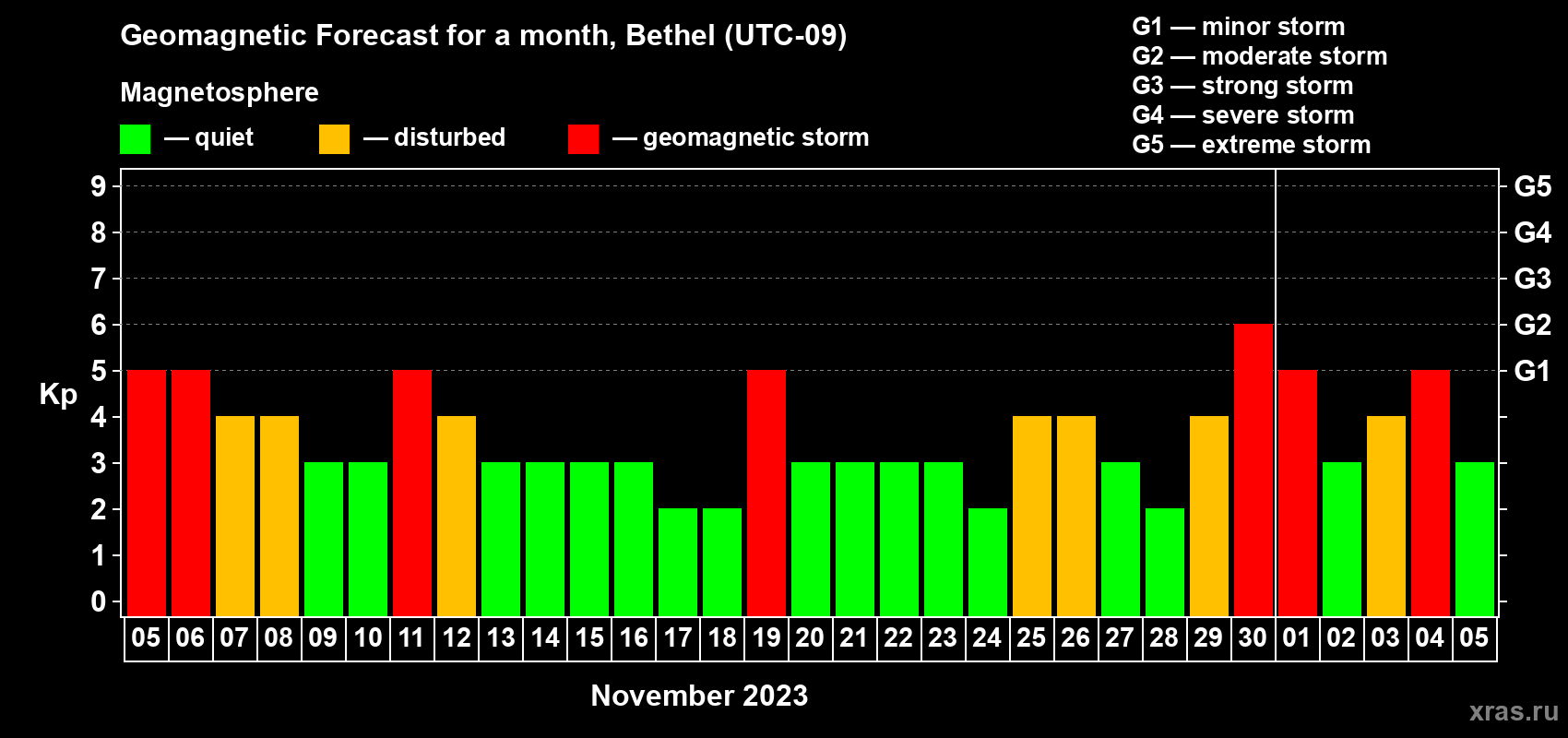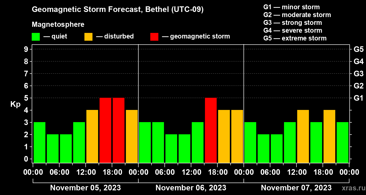 Geomagnetic storm forecast in Bethel for Nov 05, 2023