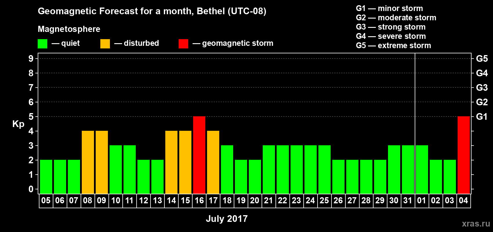 Geomagnetic storm forecast in Bethel for Jul 05, 2017