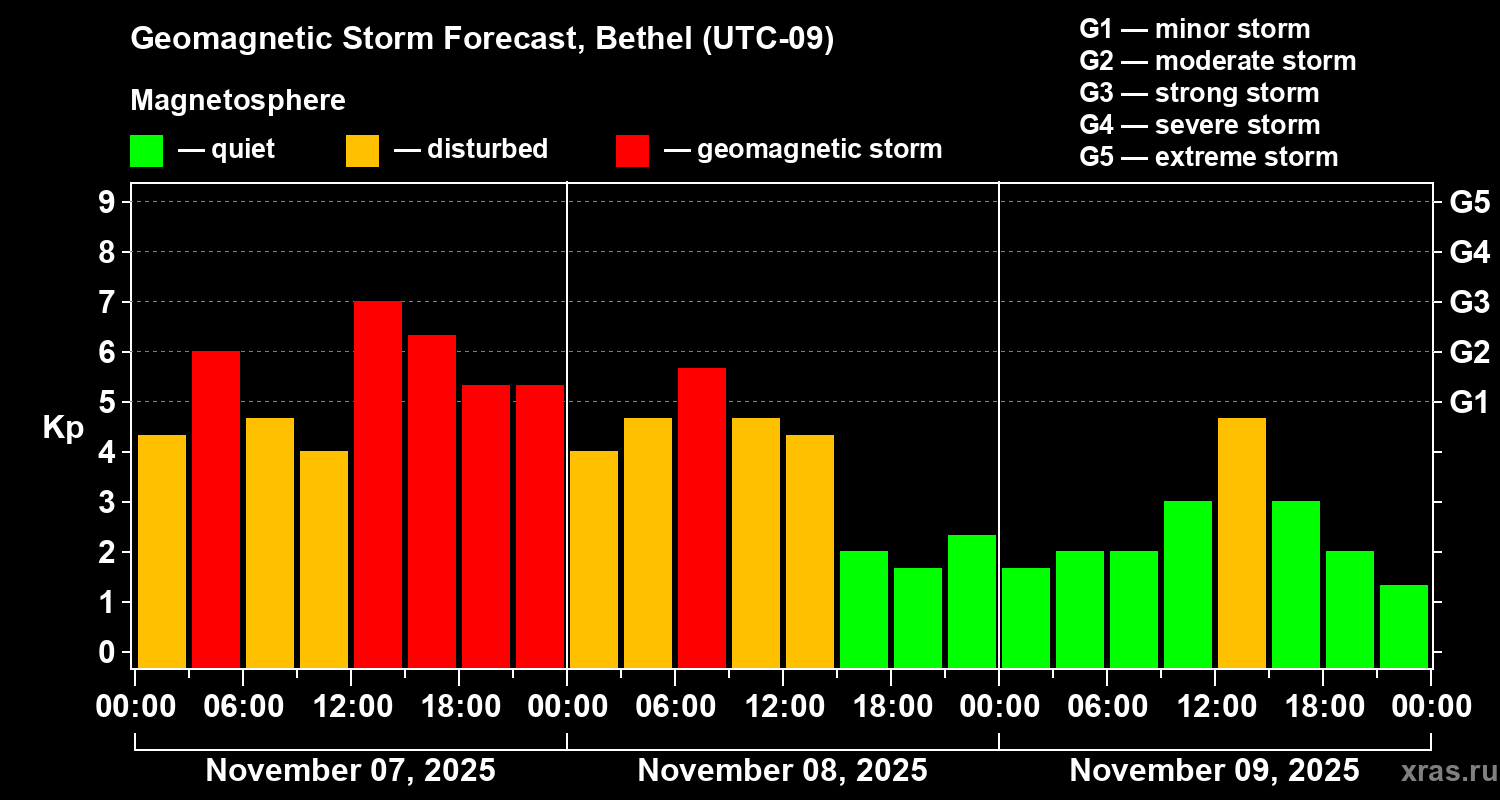 Geomagnetic storm forecast in Bethel for Nov 07, 2025