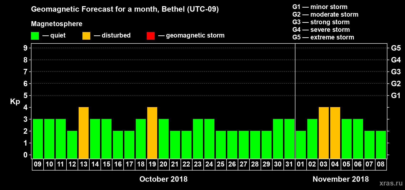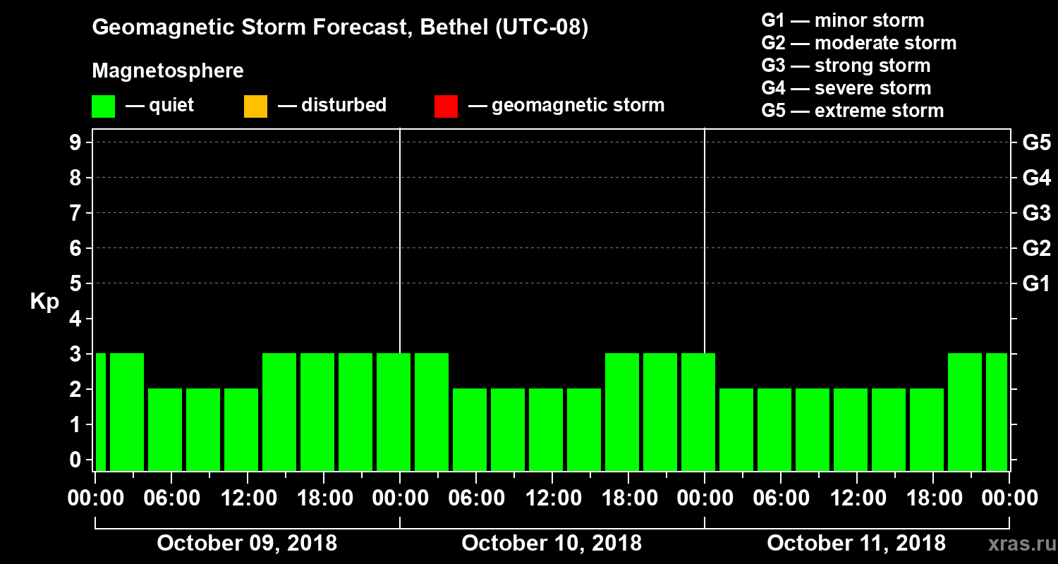 Geomagnetic storm forecast in Bethel for Oct 09, 2018