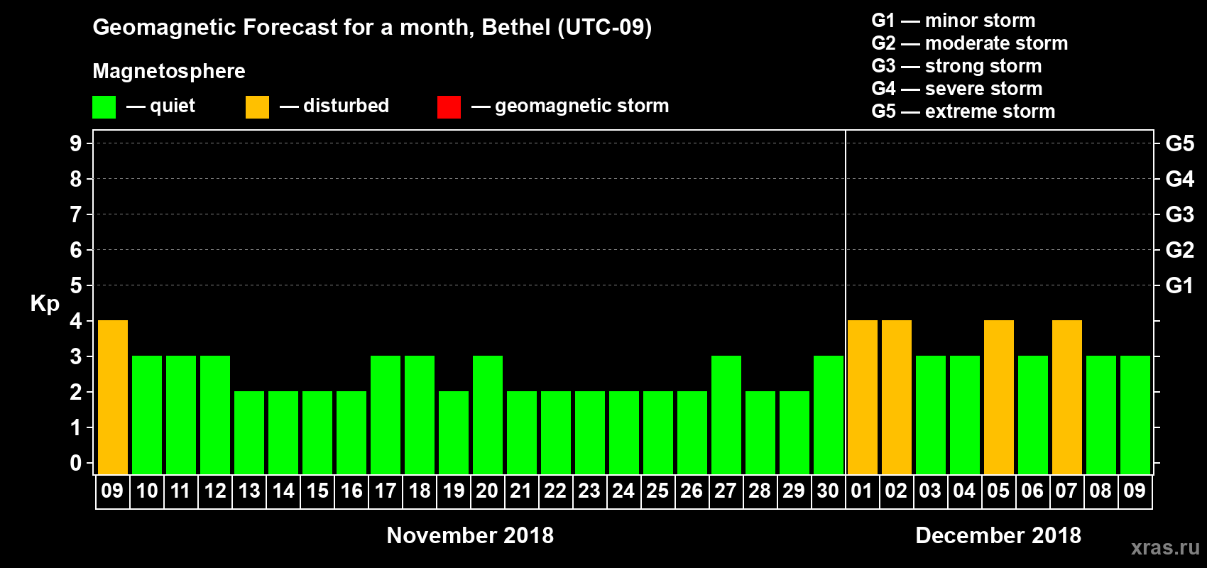 Geomagnetic storm forecast in Bethel for Nov 09, 2018