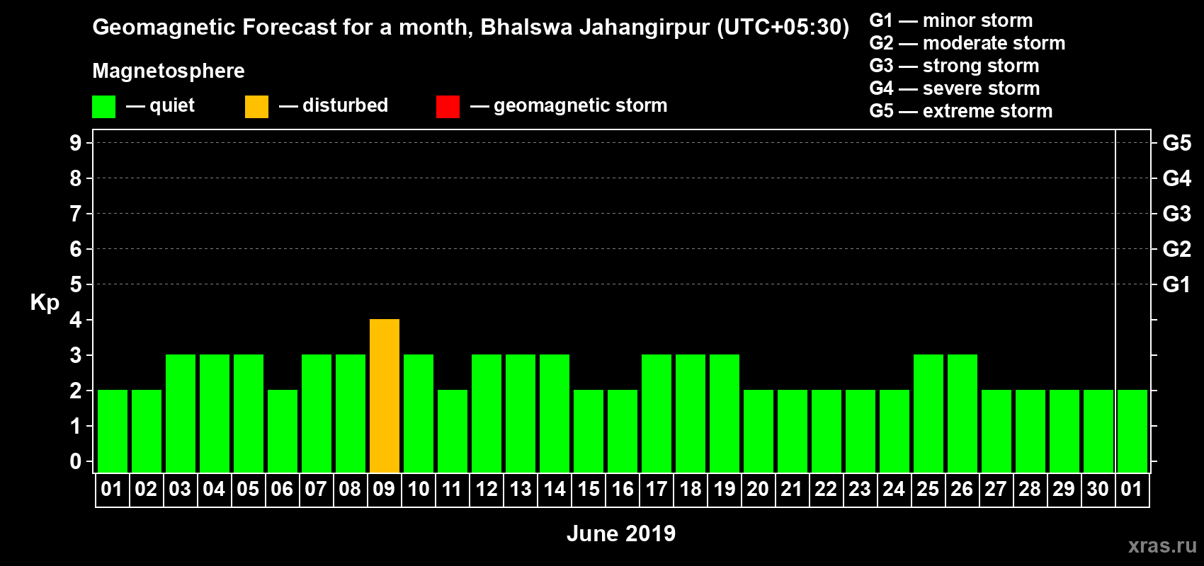 Geomagnetic storm forecast in Bhalswa Jahangirpur for Jun 01, 2019