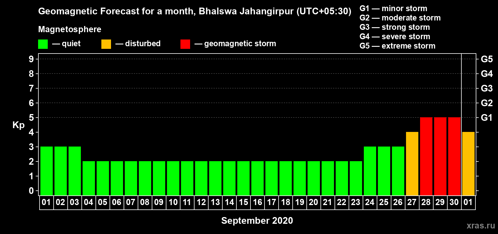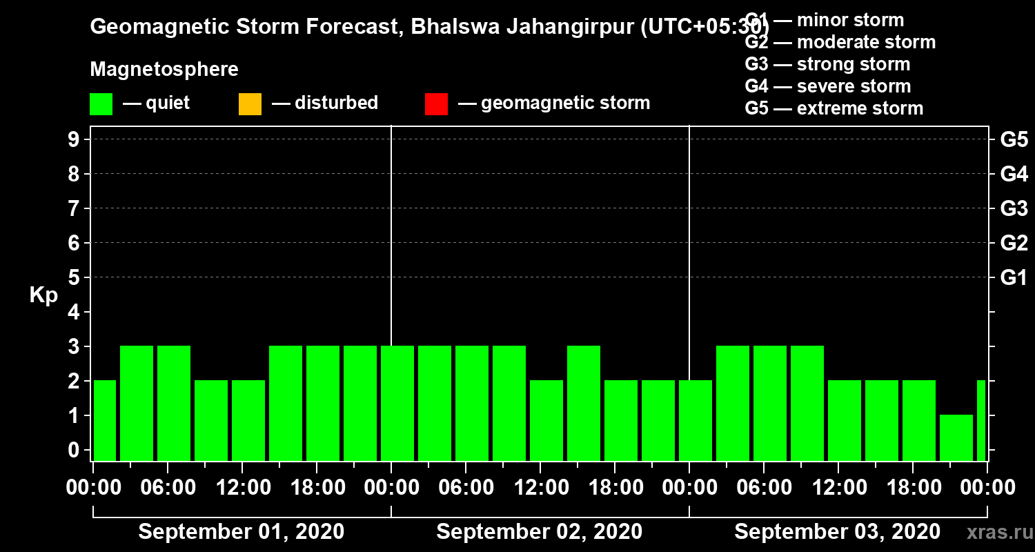 Geomagnetic storm forecast in Bhalswa Jahangirpur for Sep 01, 2020