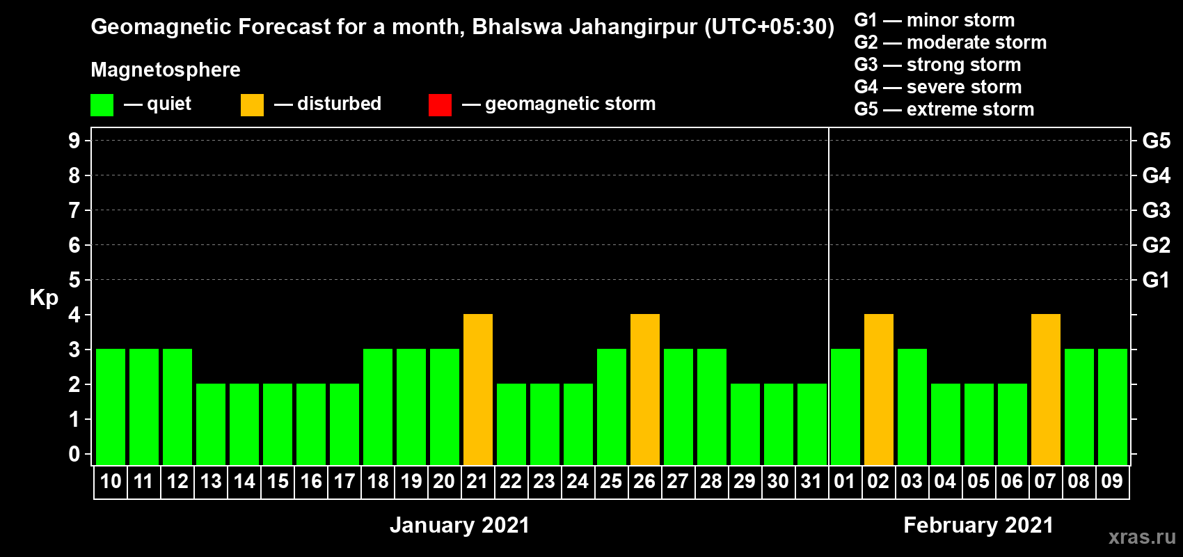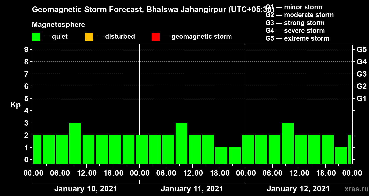 Geomagnetic storm forecast in Bhalswa Jahangirpur for Jan 10, 2021