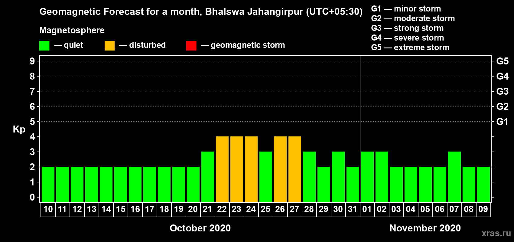 Geomagnetic storm forecast in Bhalswa Jahangirpur for Oct 10, 2020