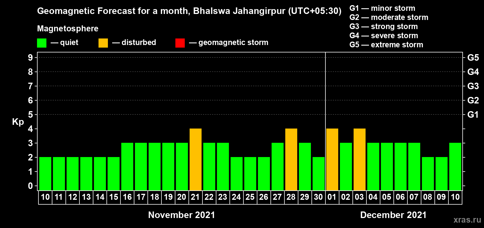 Geomagnetic storm forecast in Bhalswa Jahangirpur for Nov 10, 2021