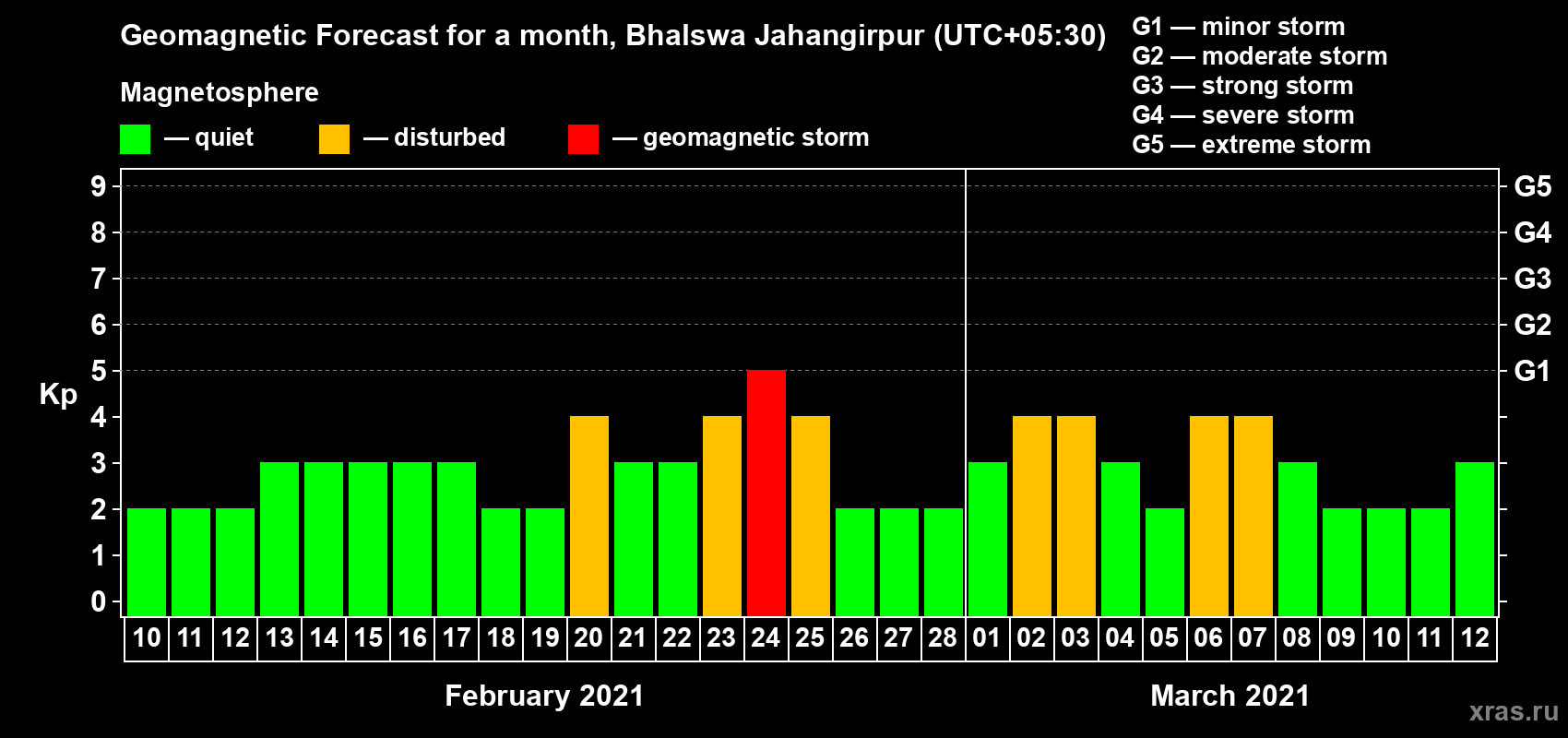 Geomagnetic storm forecast in Bhalswa Jahangirpur for Feb 10, 2021