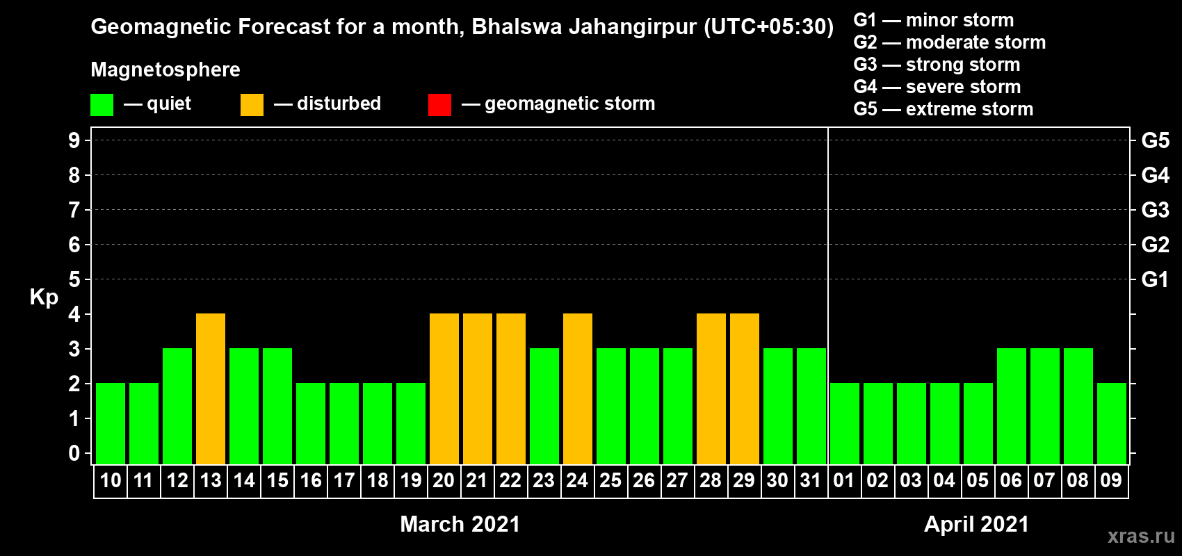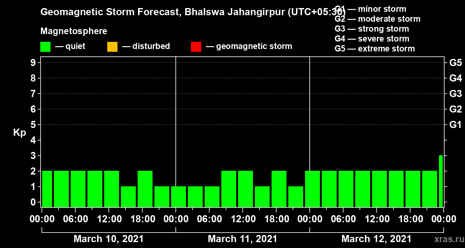 Geomagnetic storm forecast in Bhalswa Jahangirpur for Mar 10, 2021