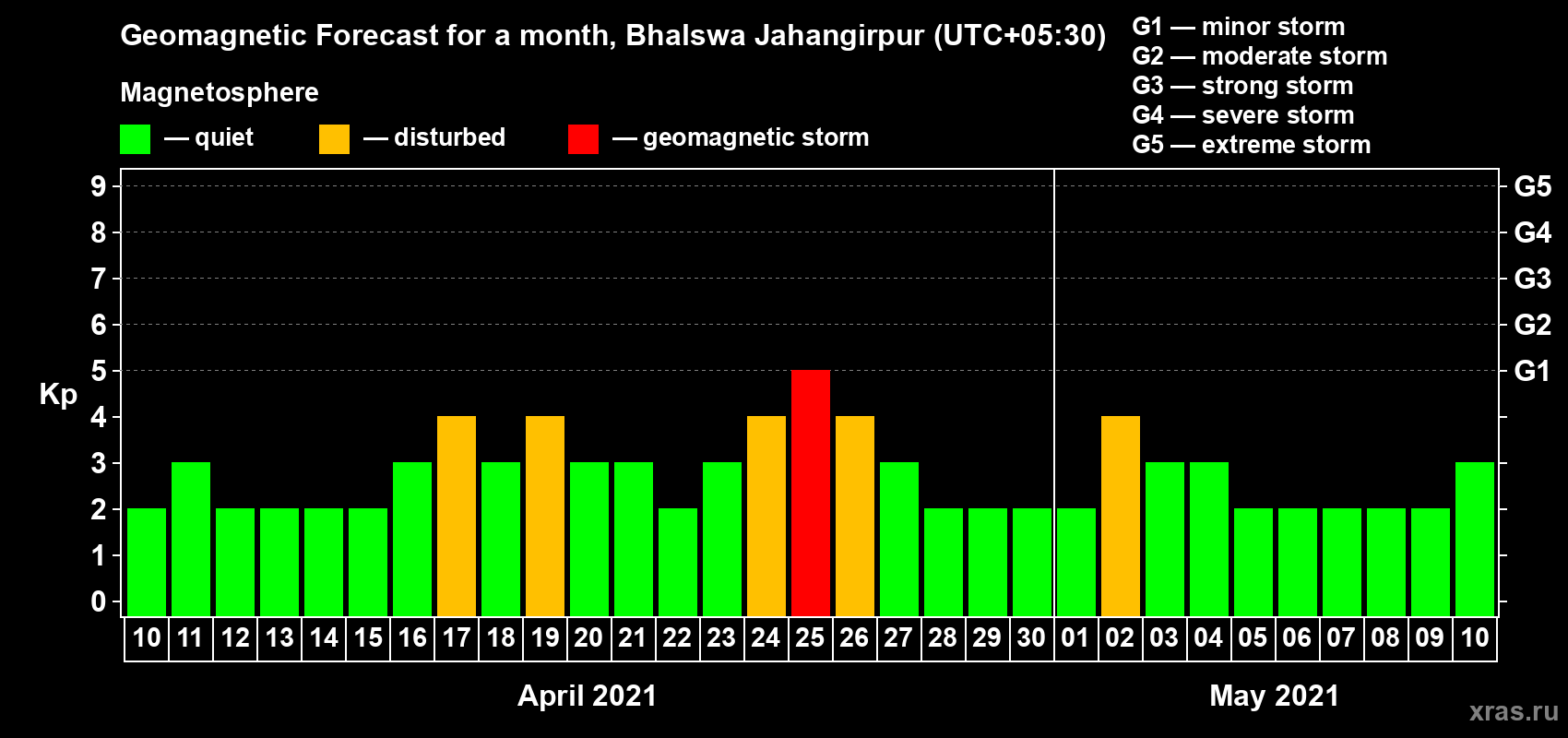 Geomagnetic storm forecast in Bhalswa Jahangirpur for Apr 10, 2021