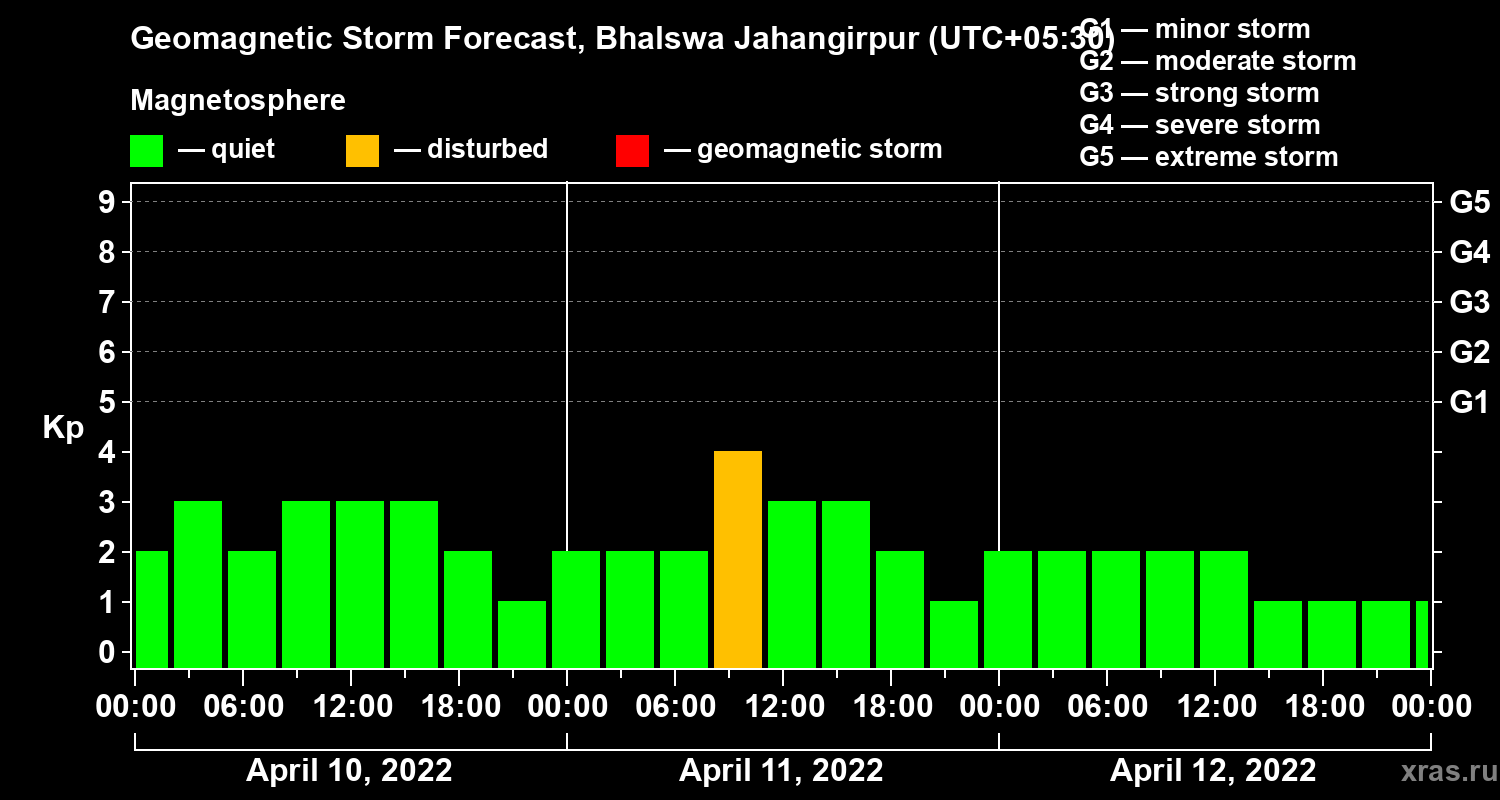 Geomagnetic storm forecast in Bhalswa Jahangirpur for Apr 10, 2022