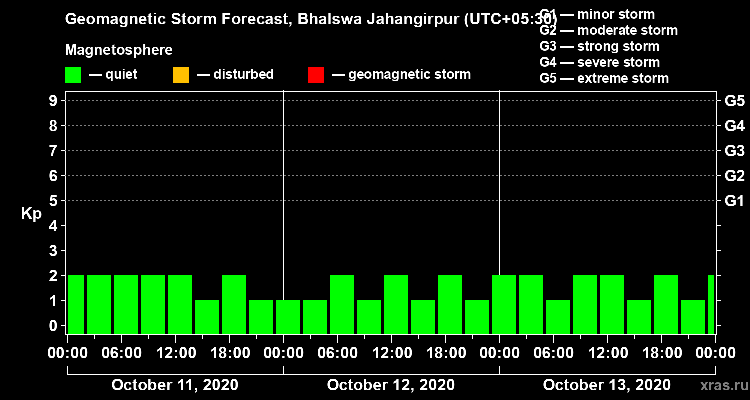 Geomagnetic storm forecast in Bhalswa Jahangirpur for Oct 11, 2020