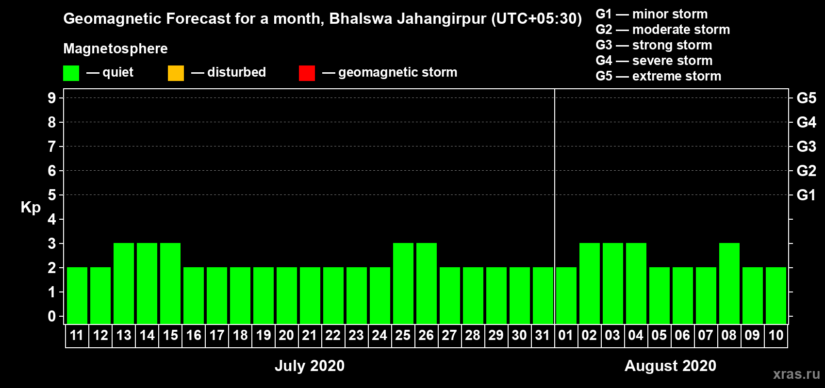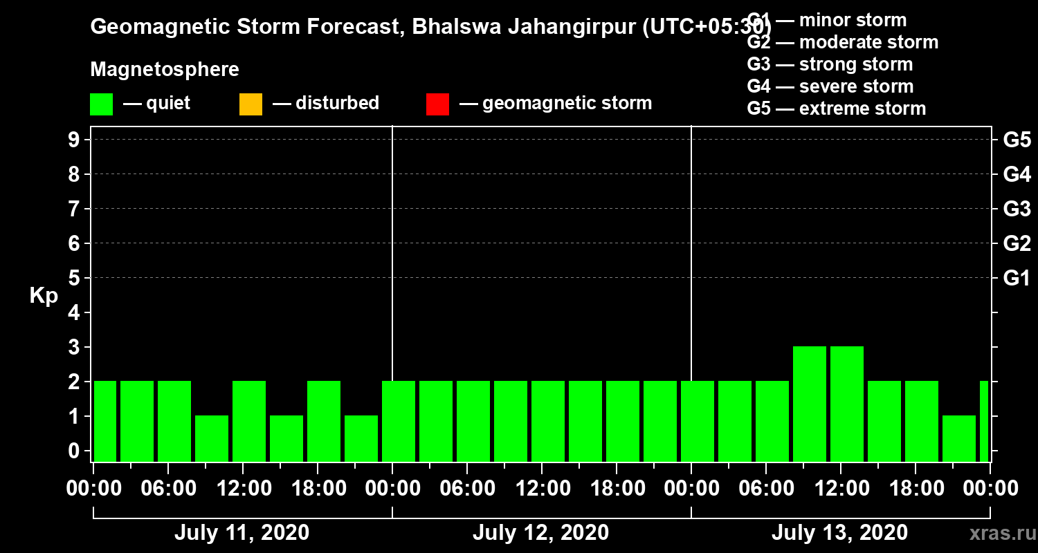 Geomagnetic storm forecast in Bhalswa Jahangirpur for Jul 11, 2020