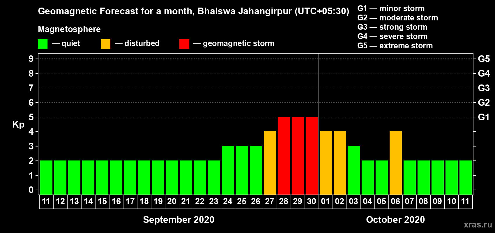 Geomagnetic storm forecast in Bhalswa Jahangirpur for Sep 11, 2020