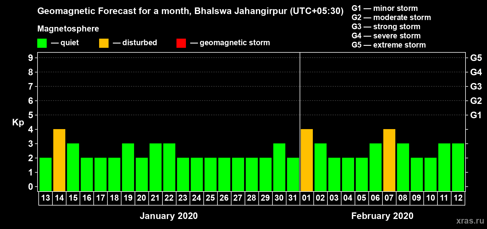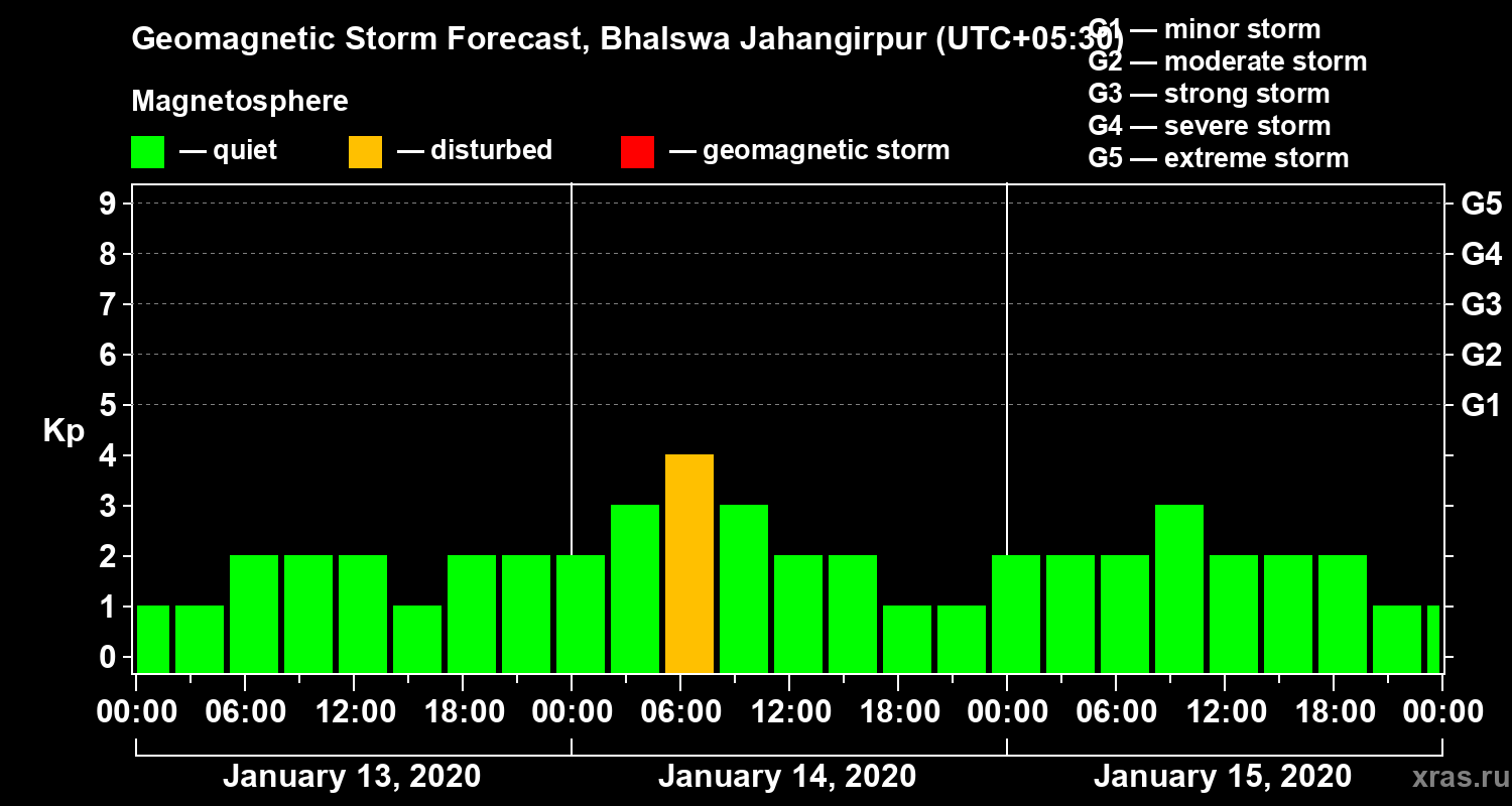 Geomagnetic storm forecast in Bhalswa Jahangirpur for Jan 13, 2020
