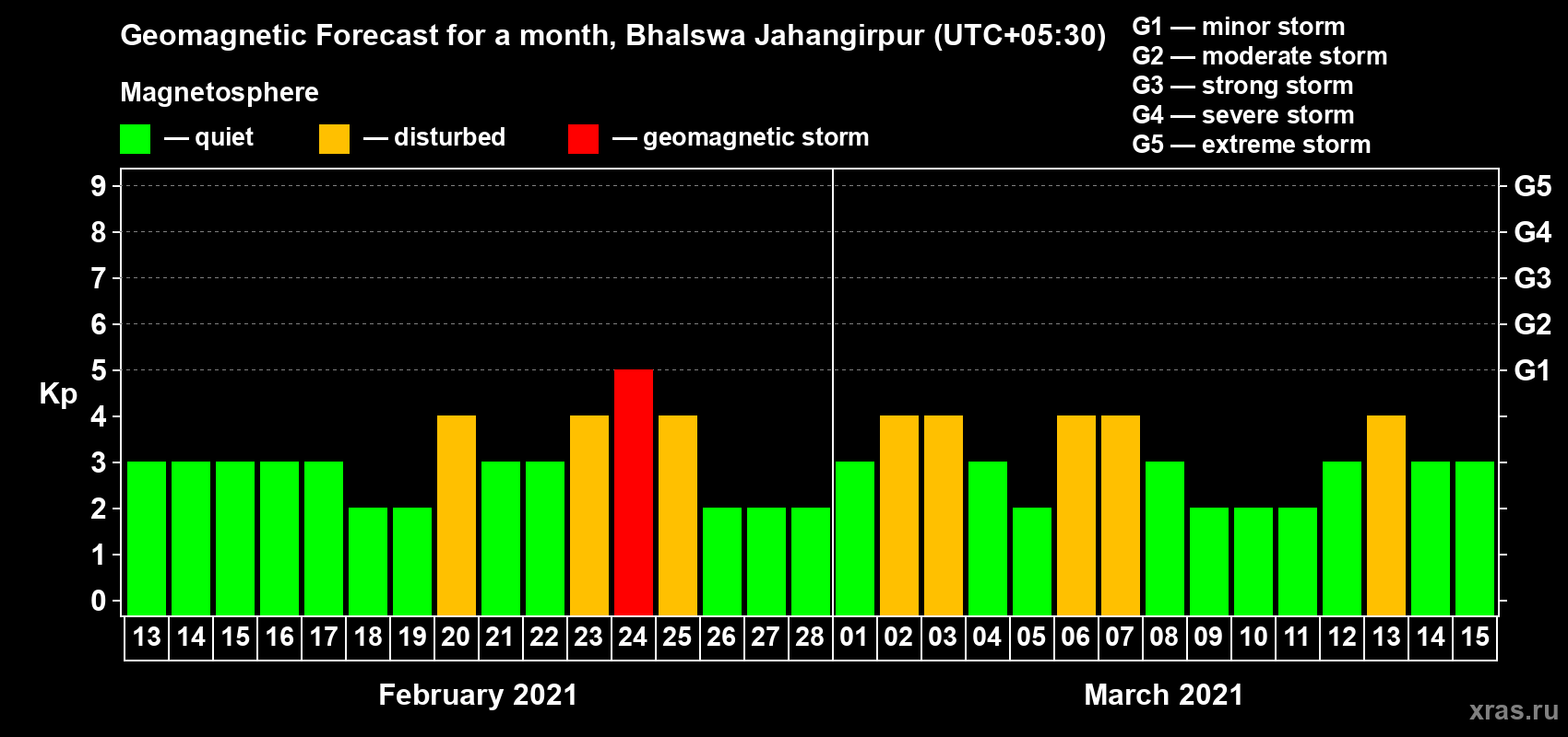 Geomagnetic storm forecast in Bhalswa Jahangirpur for Feb 13, 2021