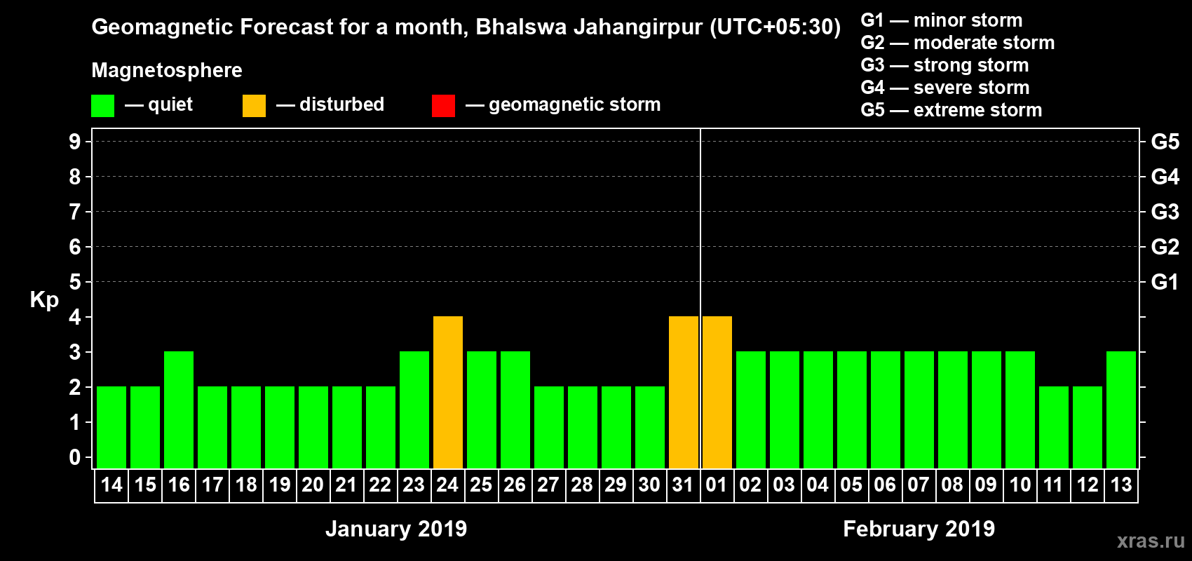 Geomagnetic storm forecast in Bhalswa Jahangirpur for Jan 14, 2019
