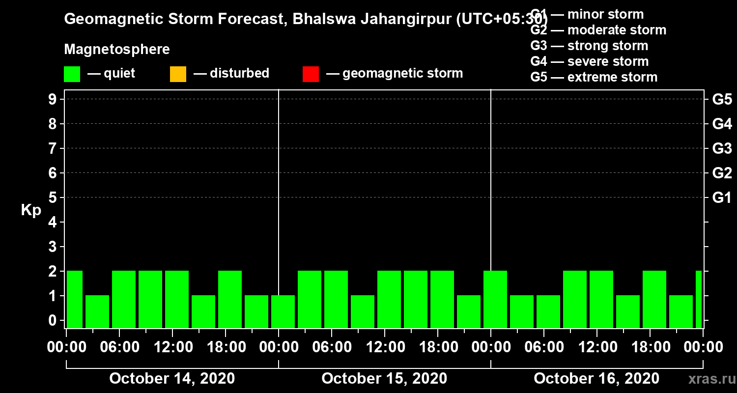 Geomagnetic storm forecast in Bhalswa Jahangirpur for Oct 14, 2020