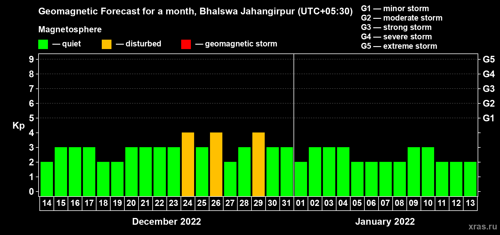 Geomagnetic storm forecast in Bhalswa Jahangirpur for Dec 14, 2021