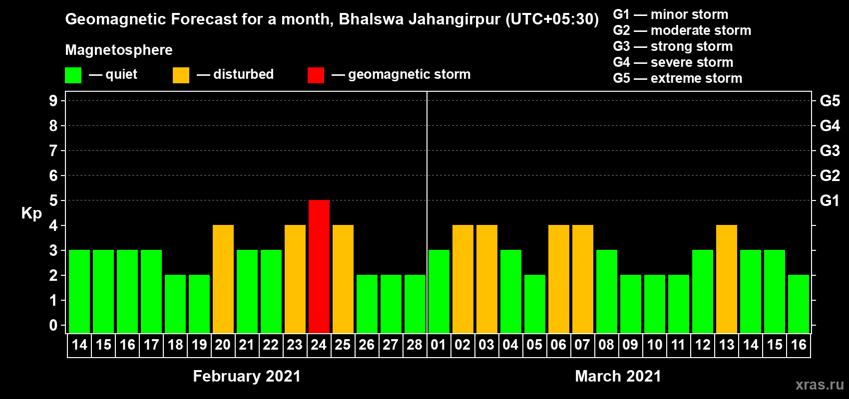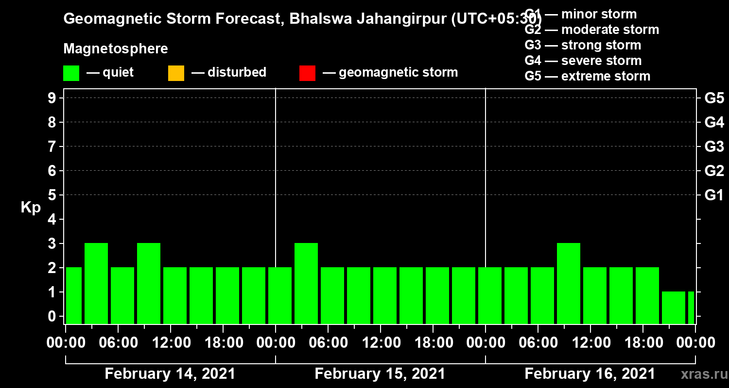 Geomagnetic storm forecast in Bhalswa Jahangirpur for Feb 14, 2021