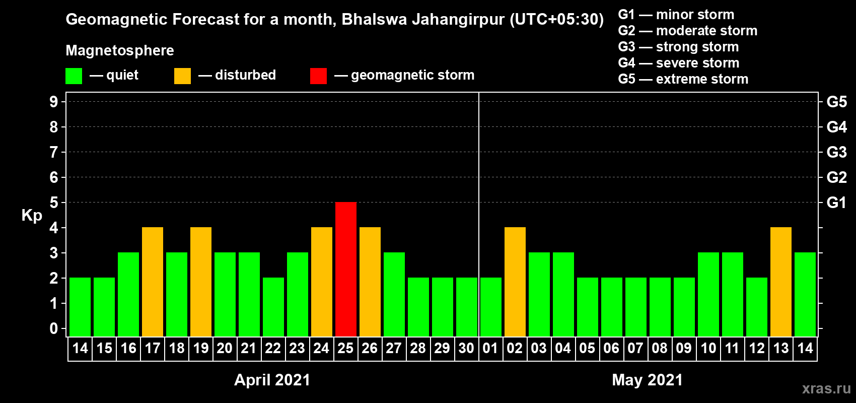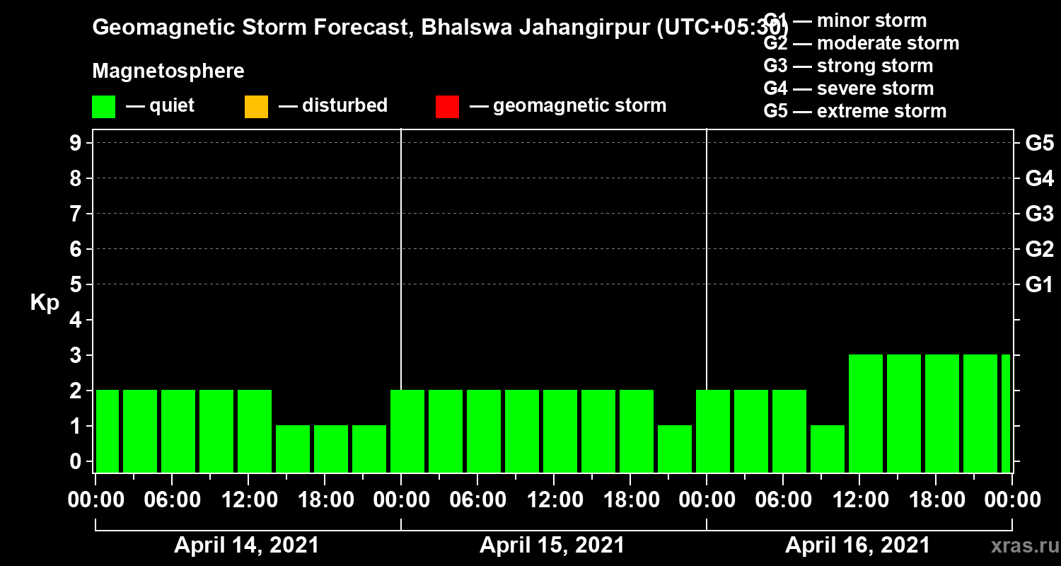 Geomagnetic storm forecast in Bhalswa Jahangirpur for Apr 14, 2021