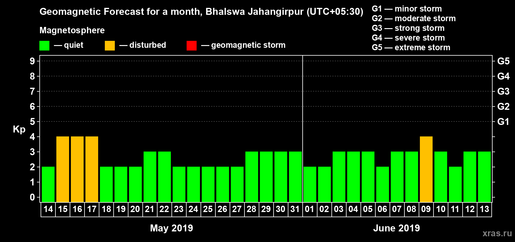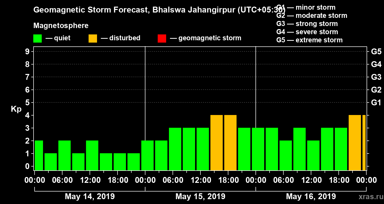 Geomagnetic storm forecast in Bhalswa Jahangirpur for May 14, 2019