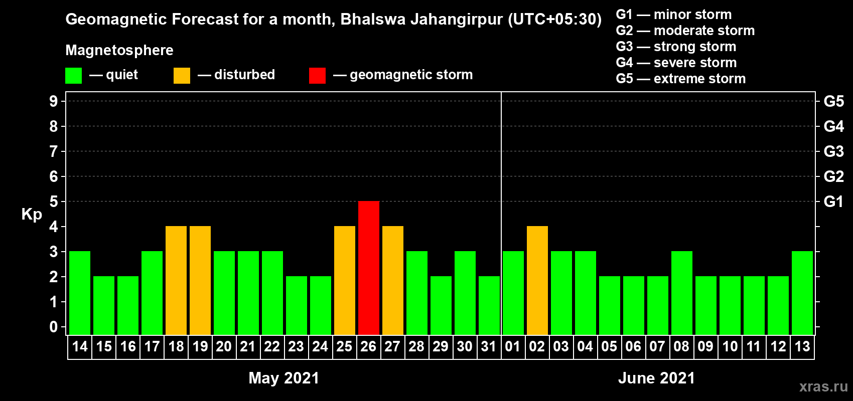 Geomagnetic storm forecast in Bhalswa Jahangirpur for May 14, 2021