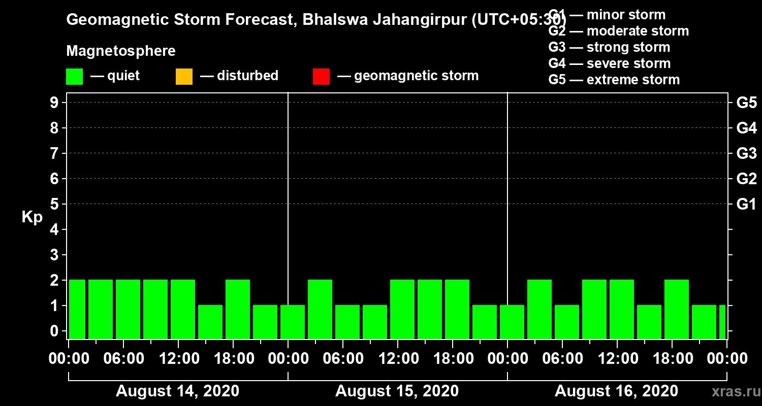 Geomagnetic storm forecast in Bhalswa Jahangirpur for Aug 14, 2020