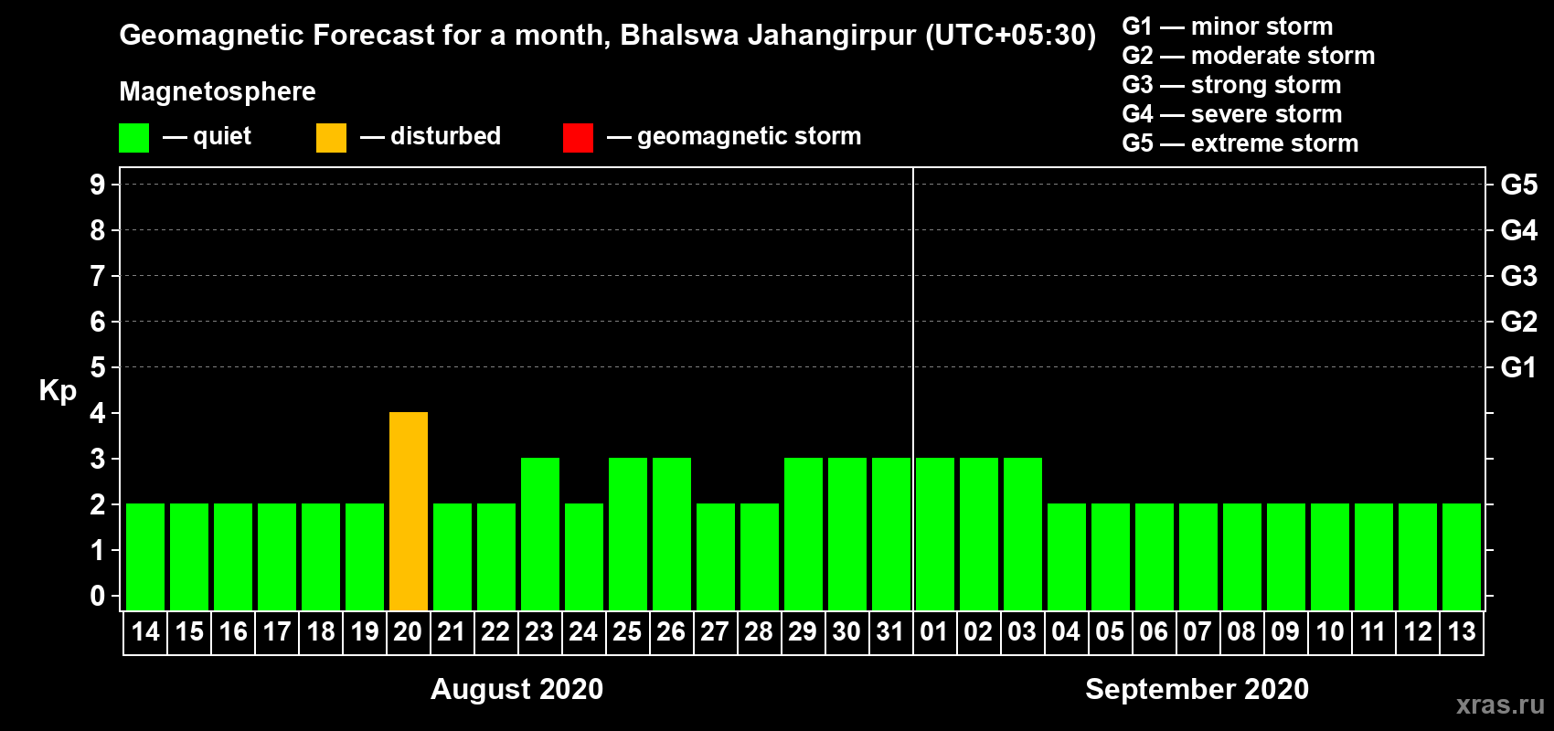 Geomagnetic activity forecast in Bhalswa Jahangirpur — Aug 14, 2020