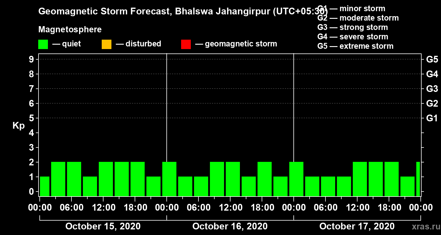 Geomagnetic storm forecast in Bhalswa Jahangirpur for Oct 15, 2020