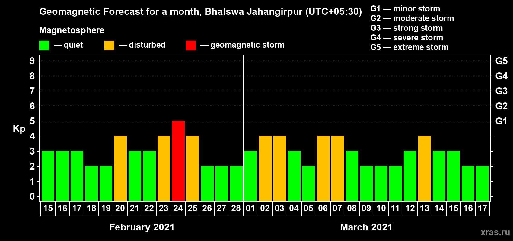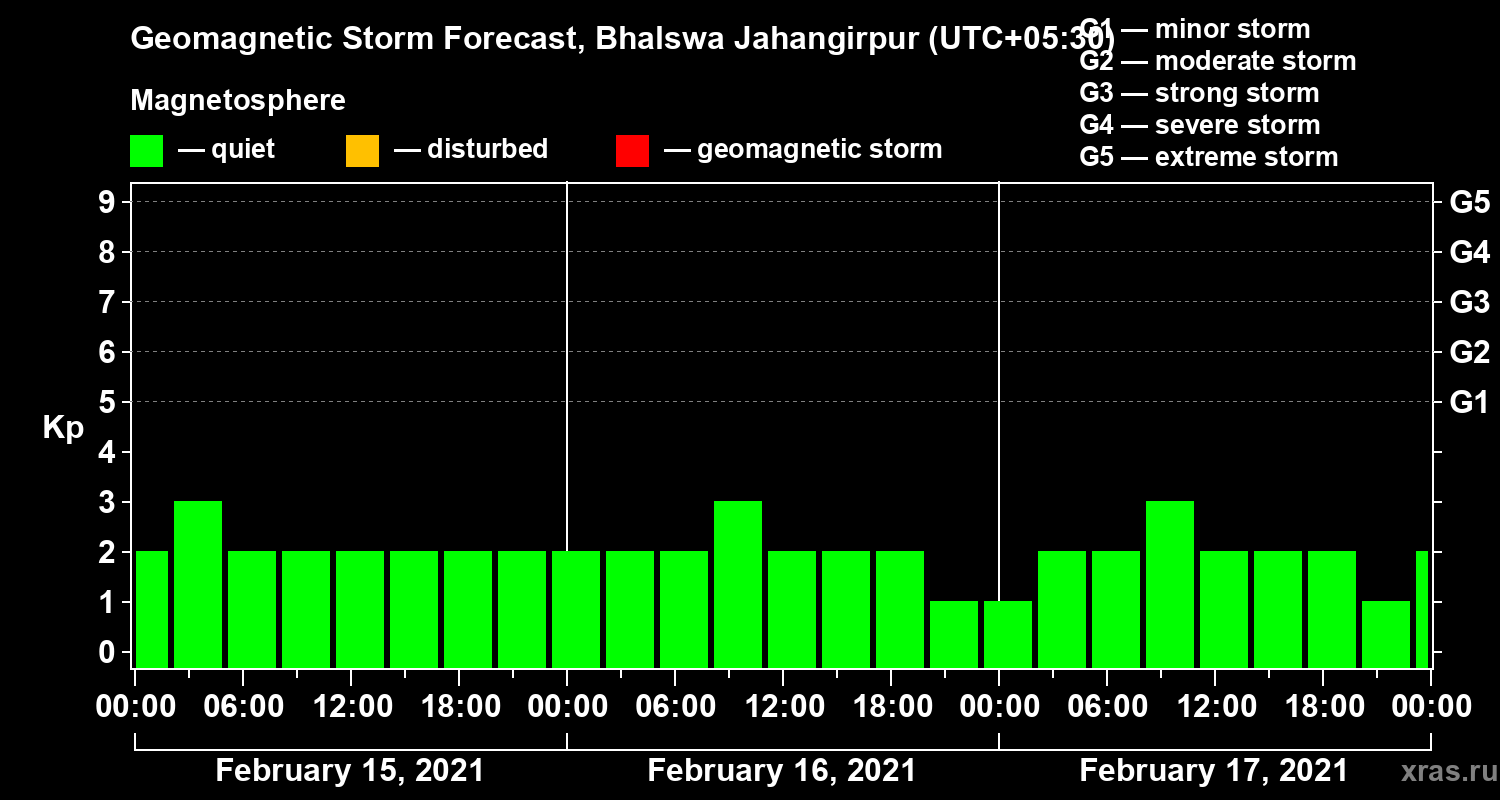 Geomagnetic storm forecast in Bhalswa Jahangirpur for Feb 15, 2021