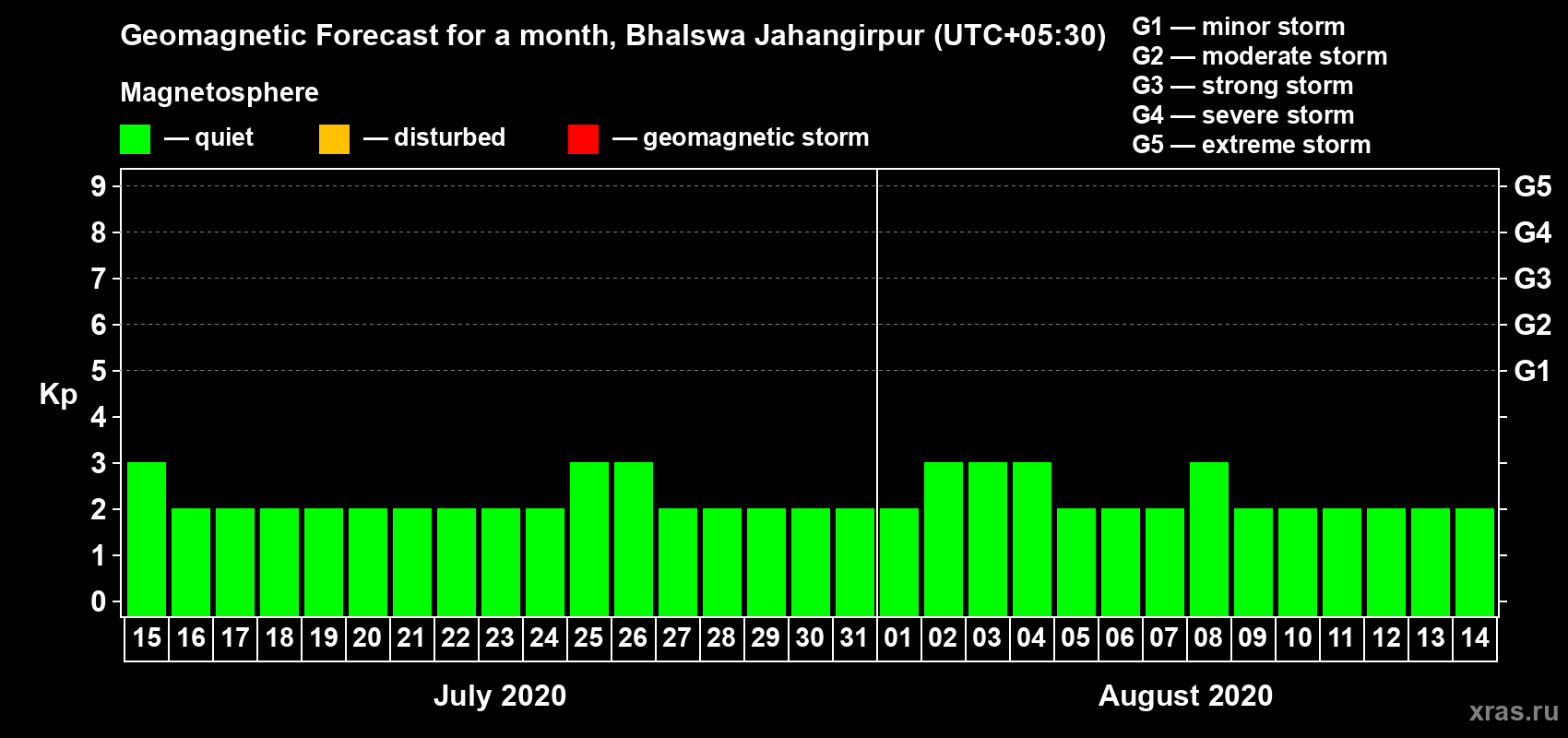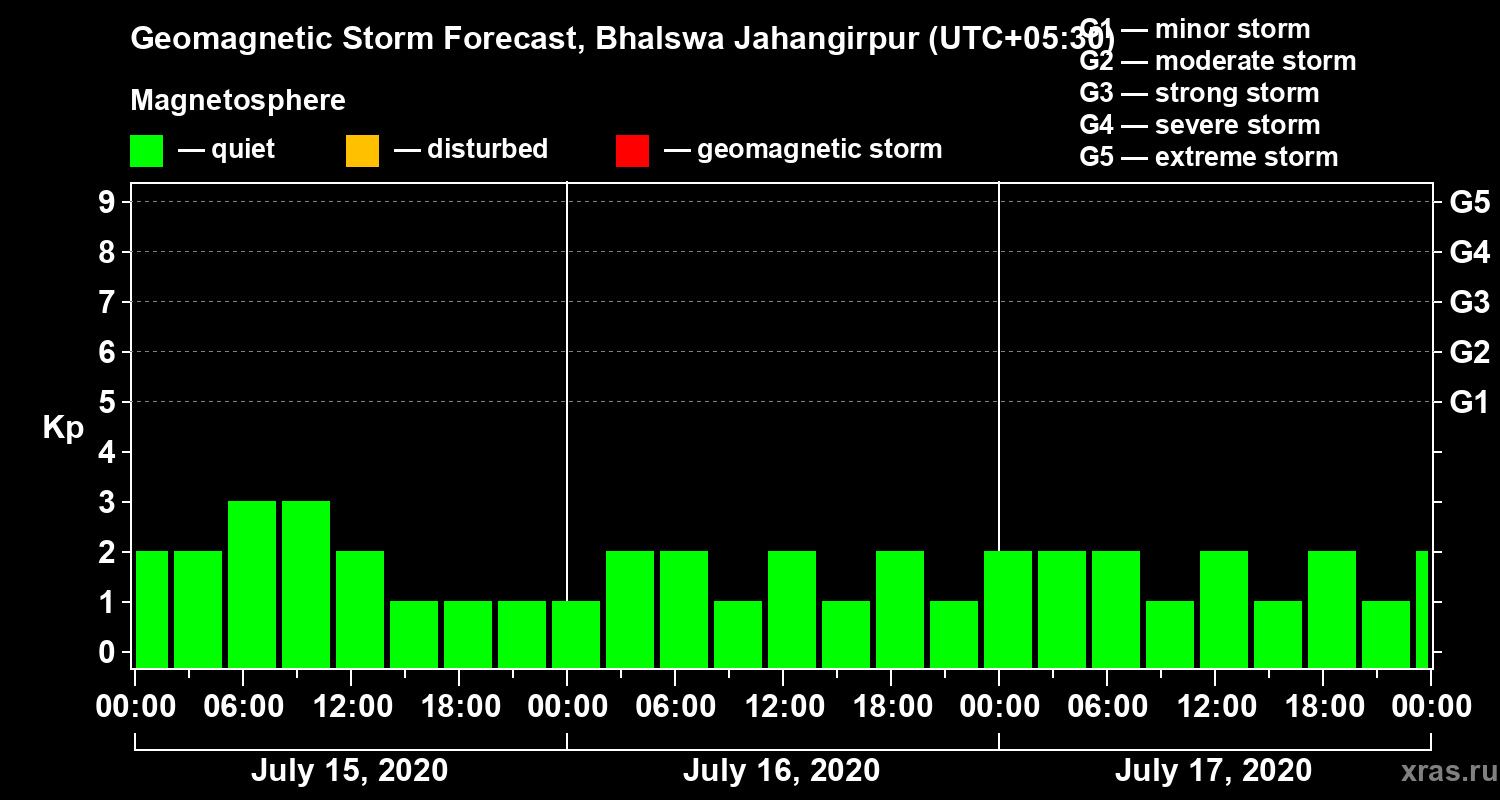 Geomagnetic storm forecast in Bhalswa Jahangirpur for Jul 15, 2020