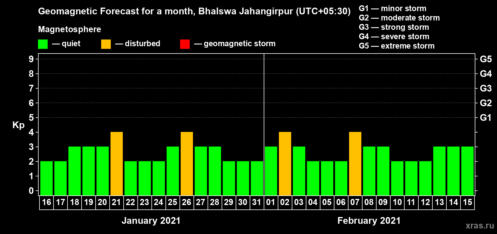 Geomagnetic storm forecast in Bhalswa Jahangirpur for Jan 16, 2021