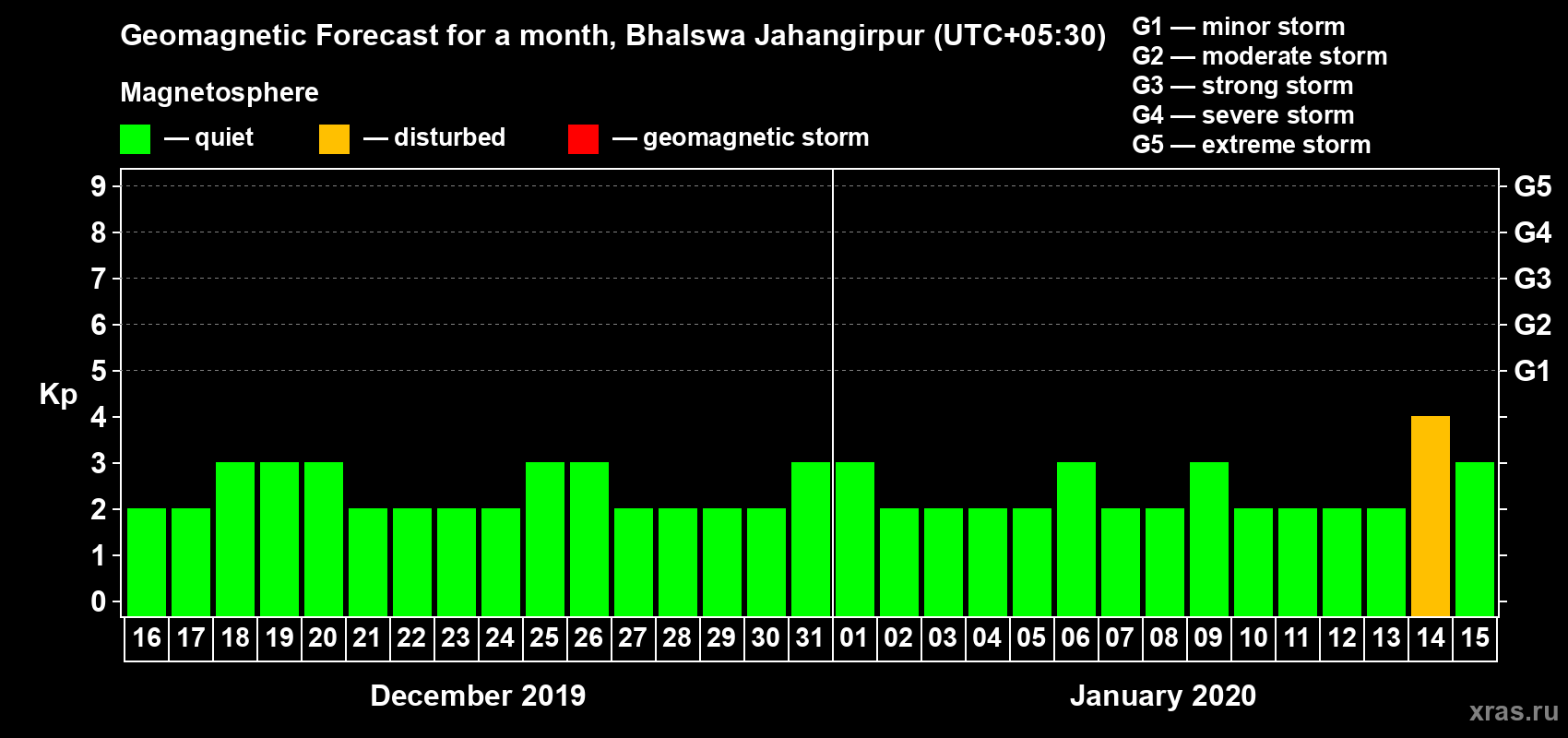 Geomagnetic storm forecast in Bhalswa Jahangirpur for Dec 16, 2019