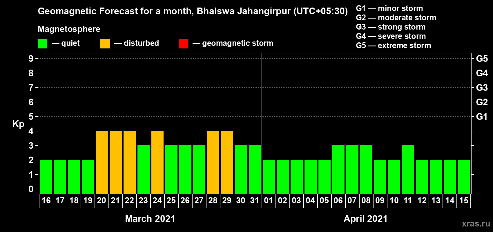 Geomagnetic storm forecast in Bhalswa Jahangirpur for Mar 16, 2021