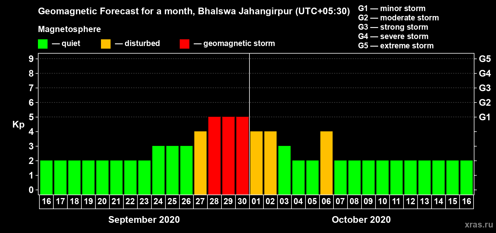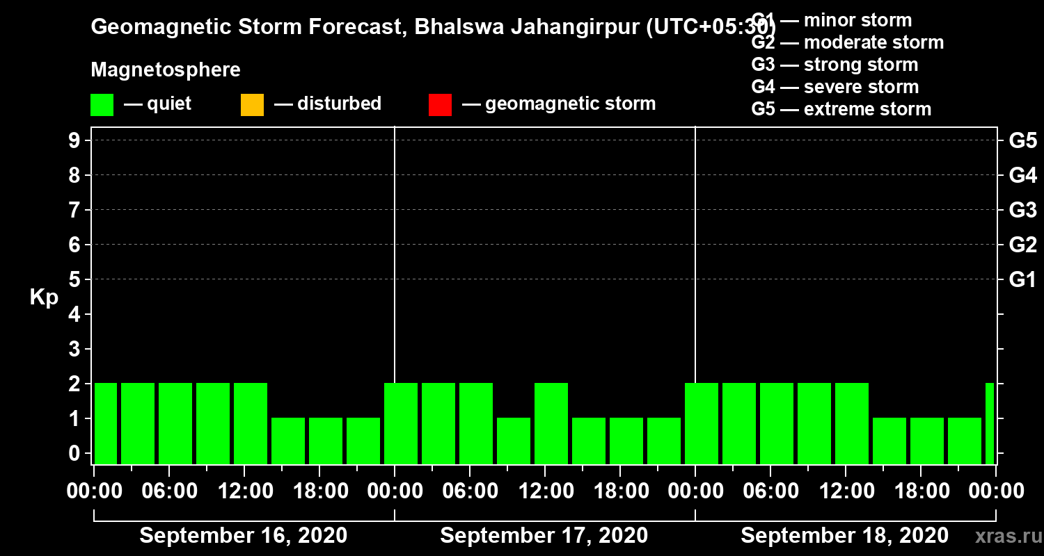 Geomagnetic storm forecast in Bhalswa Jahangirpur for Sep 16, 2020