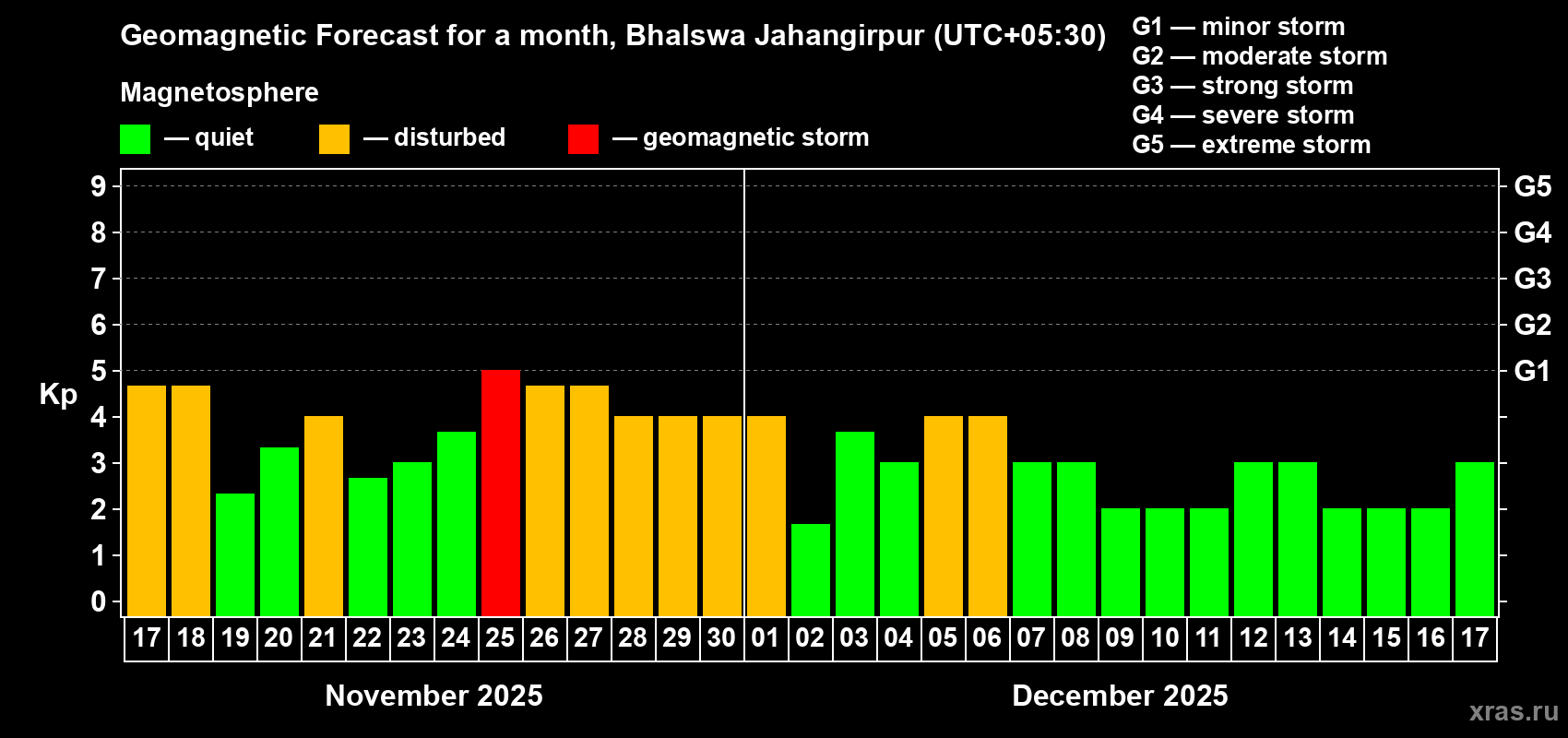 Geomagnetic storm forecast in Bhalswa Jahangirpur for Nov 17, 2025