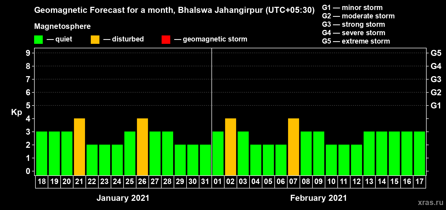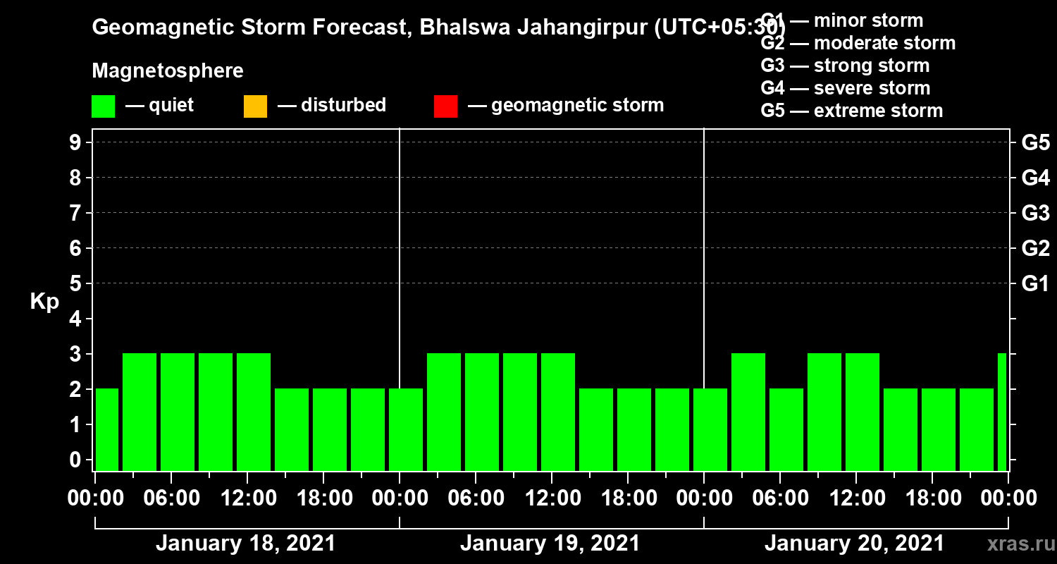 Geomagnetic storm forecast in Bhalswa Jahangirpur for Jan 18, 2021