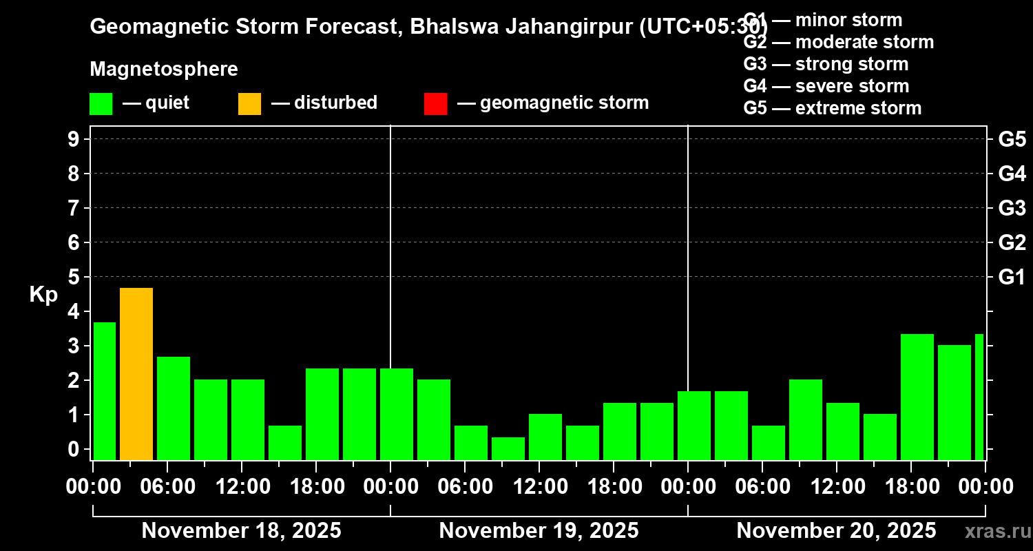 Geomagnetic storm forecast in Bhalswa Jahangirpur for Nov 18, 2025