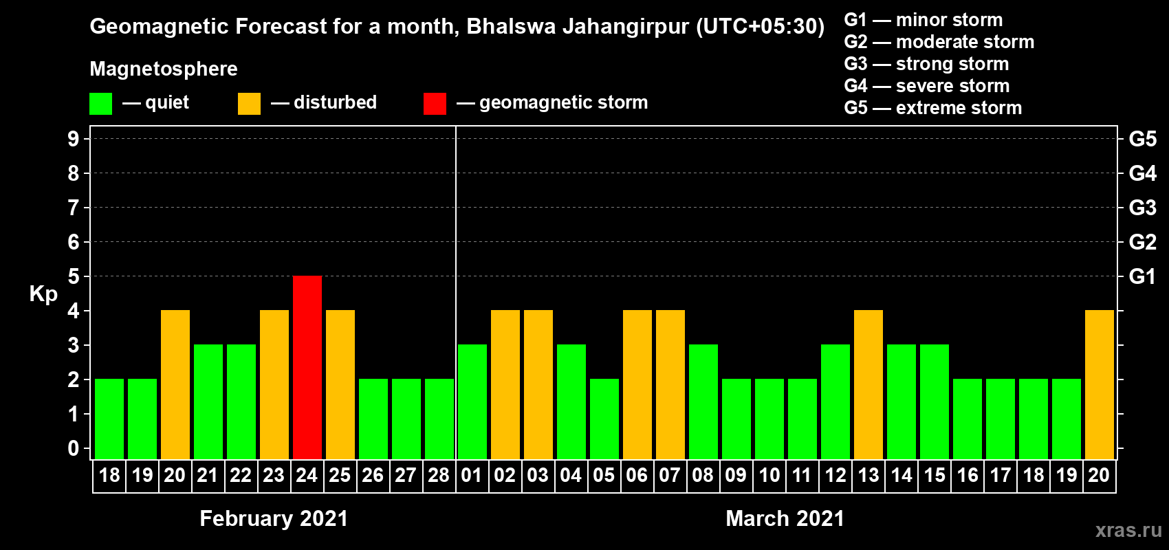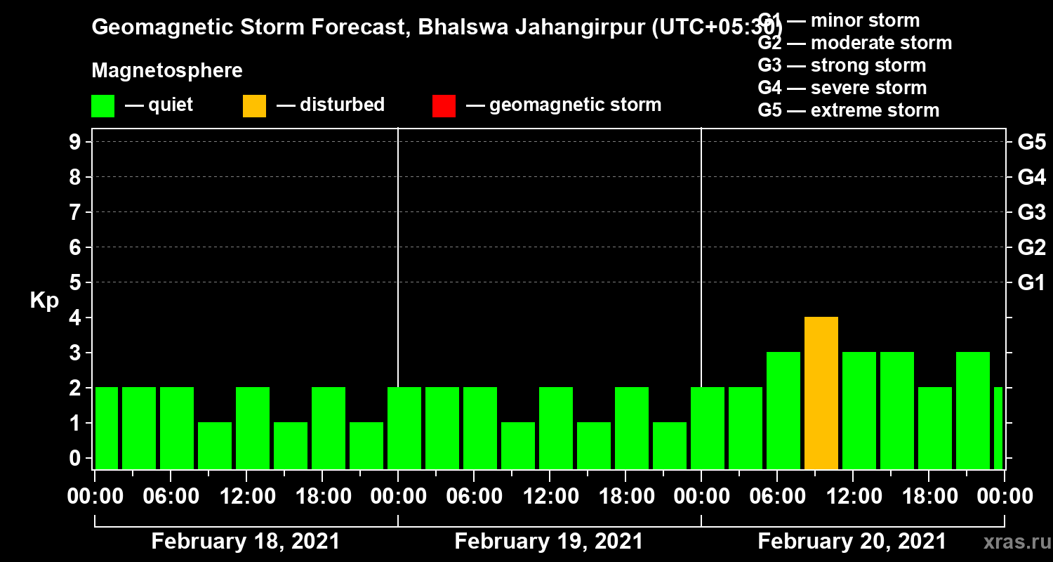 Geomagnetic storm forecast in Bhalswa Jahangirpur for Feb 18, 2021