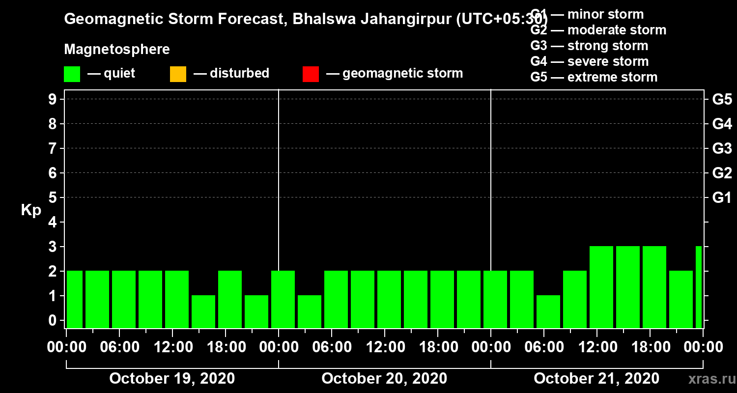 Geomagnetic storm forecast in Bhalswa Jahangirpur for Oct 19, 2020