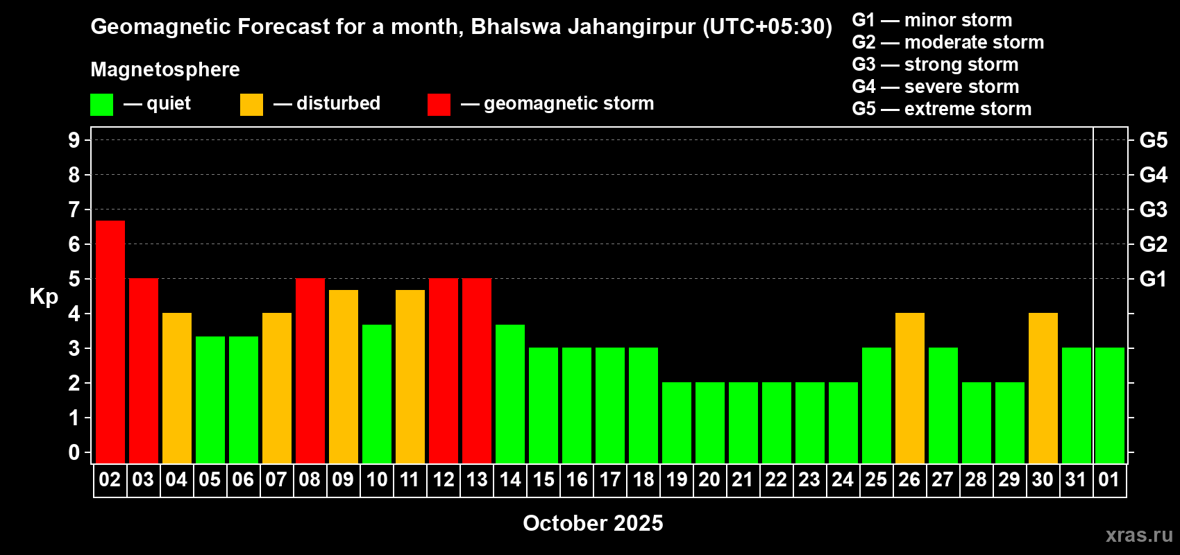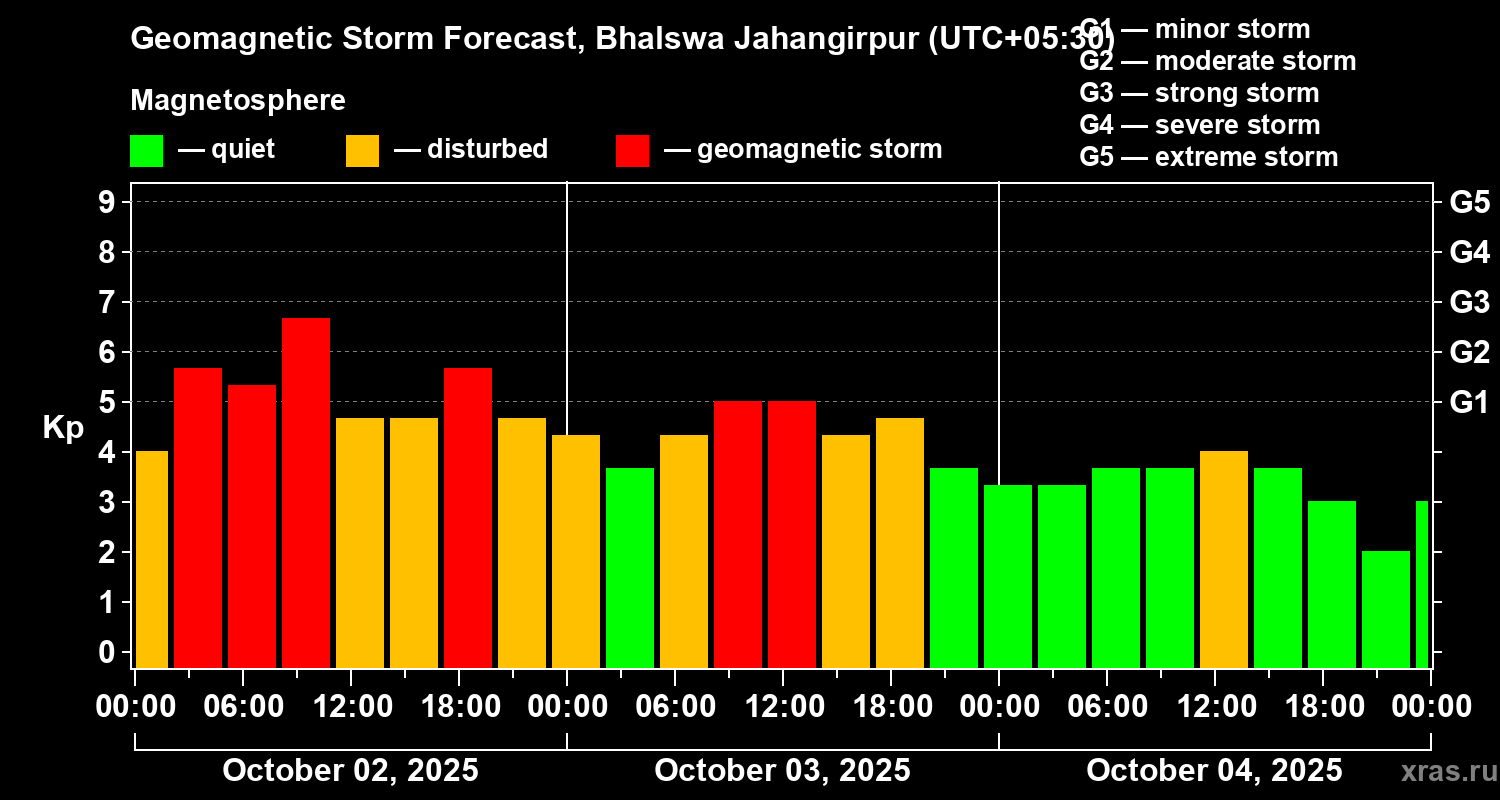 Geomagnetic storm forecast in Bhalswa Jahangirpur for Oct 02, 2025