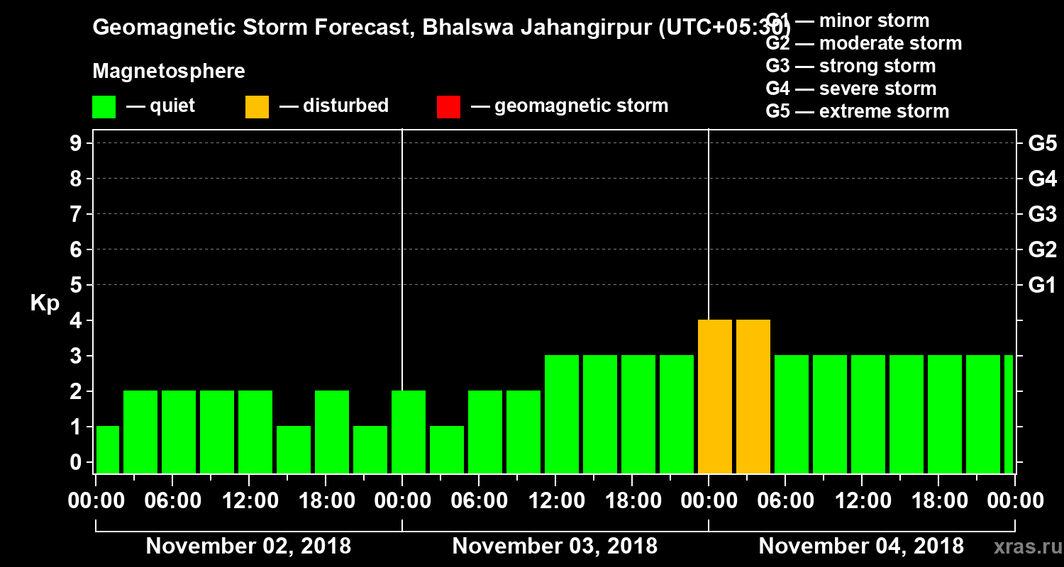 Geomagnetic storm forecast in Bhalswa Jahangirpur for Nov 02, 2018